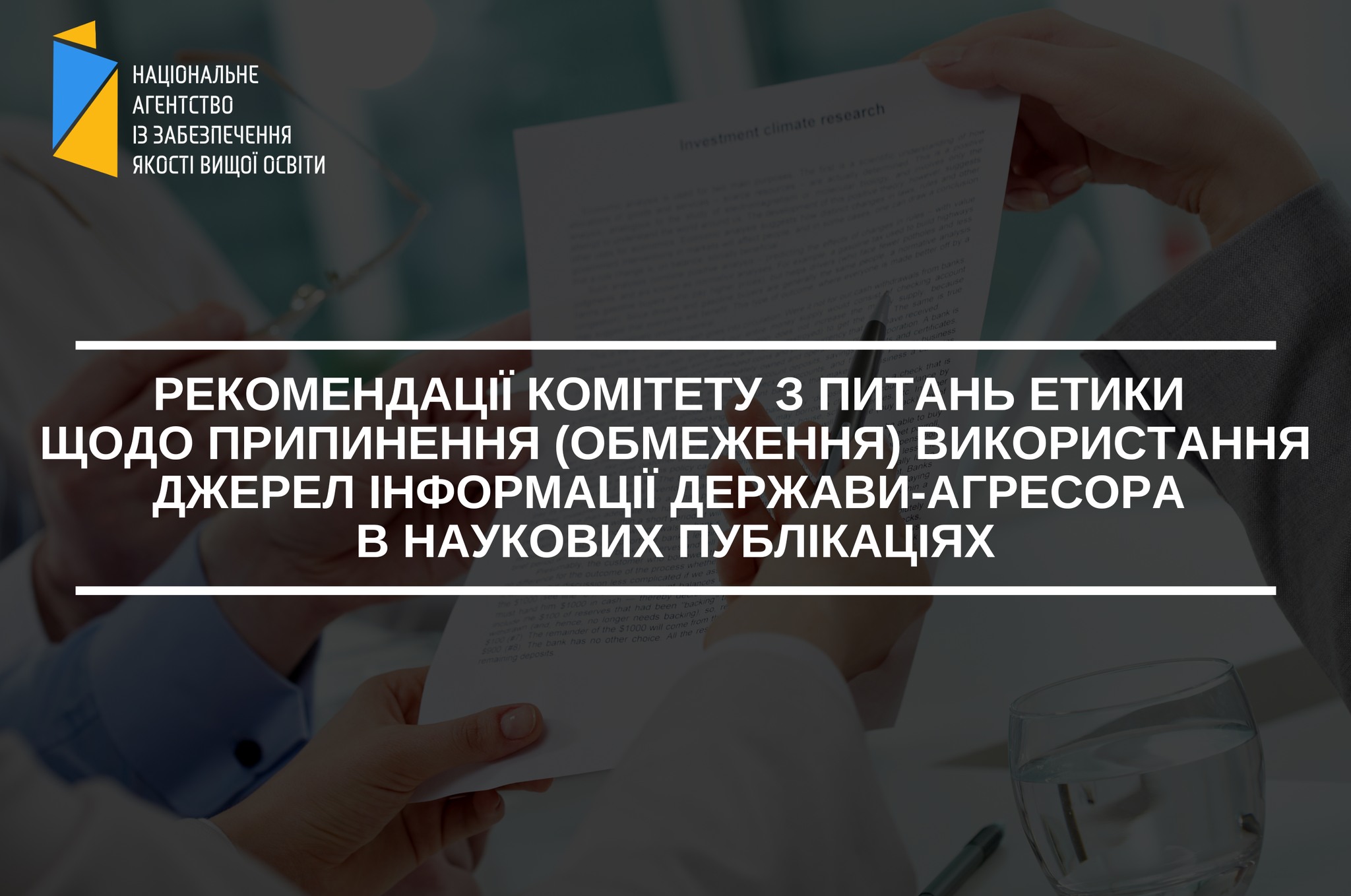 Наведені обставини зумовили підготовку Комітетом з питань етики Національного агентства Рекомендацій щодо припинення (обмеження) використання джерел інформації держави-агресора в наукових публікаціях, з якими ви можете ознайомитись за посиланням: https://bit.ly/3T8iKiW