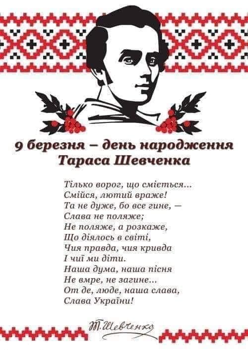 Сьогодні, в криваві дні для України, коли країна виборює свою незалежність, кожне слово Тараса Шевченка стає пророчим і актуальним. Шлях до перемоги завжди важкий і кривавий. Але час, який ми переживаємо – великий. Чинімо за Кобзаревим заповітом: «Борітеся – поборете! Вам Бог помагає!».