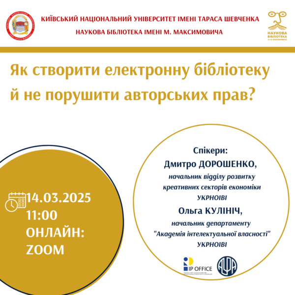 14 березня НБ КНУ Т. Шевченка за підтримки Академії інтелектуальної власності, УКРНОІВІ та Асоціації українських редакторів провели вебінар «Як створити електронну бібліотеку й не порушити авторських прав?».