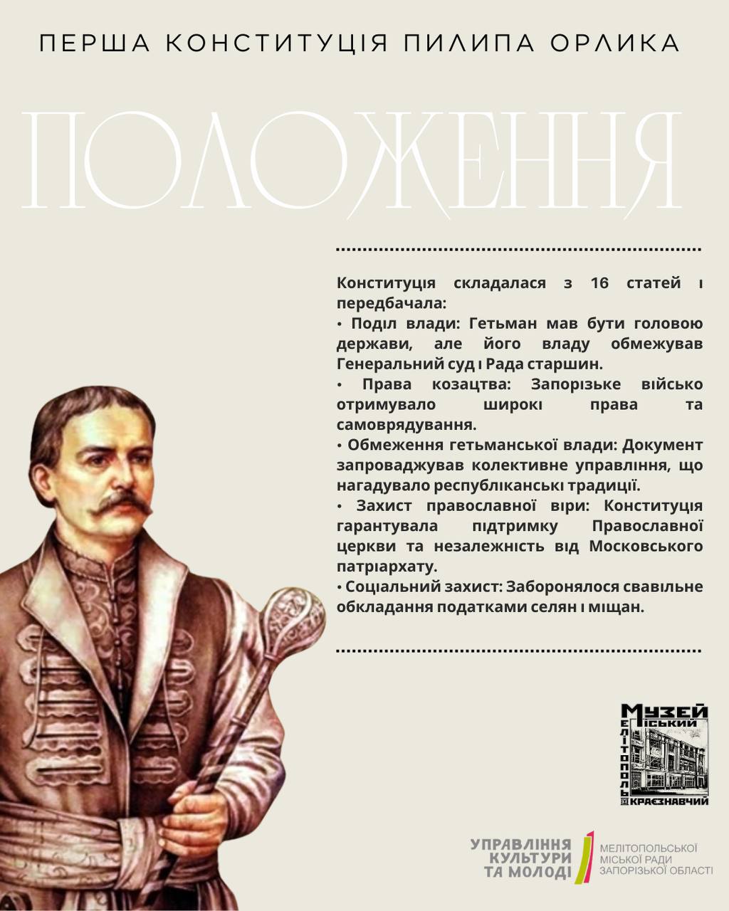 «Конституція прав і свобод Війська Запорозького» проголошувала поділ влади на законодавчу, виконавчу та судову, гарантувала права козацтва й обмежувала гетьманську владу, щоб уникнути тиранії.