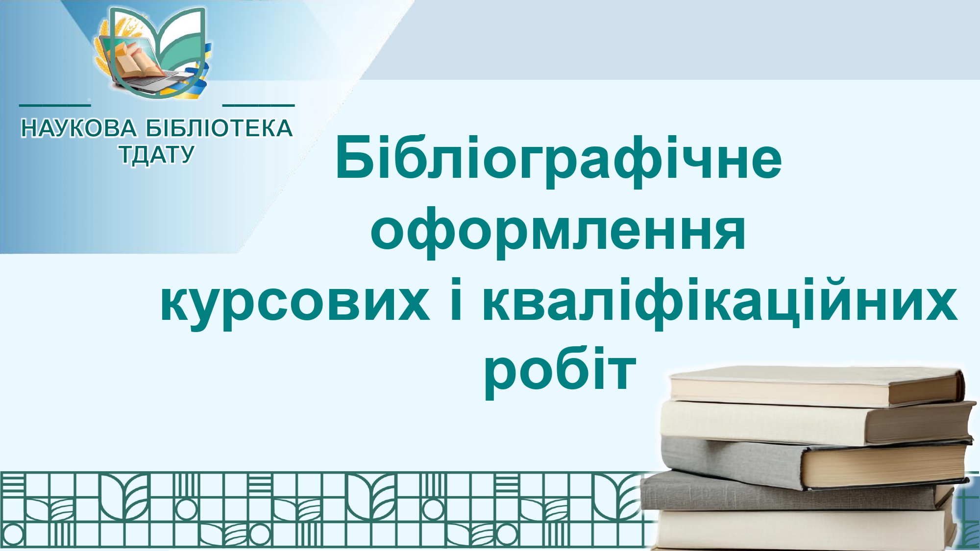 Фахівці наукової бібліотеки підготували презентацію «Бібліографічне оформлення курсових і кваліфікаційних робіт» з урахуванням вимог стандарту ДСТУ 8302:2015 і доступно пояснює, як правильно оформлювати список використаних джерел, цитати та посилання у курсових і кваліфікаційних роботах.