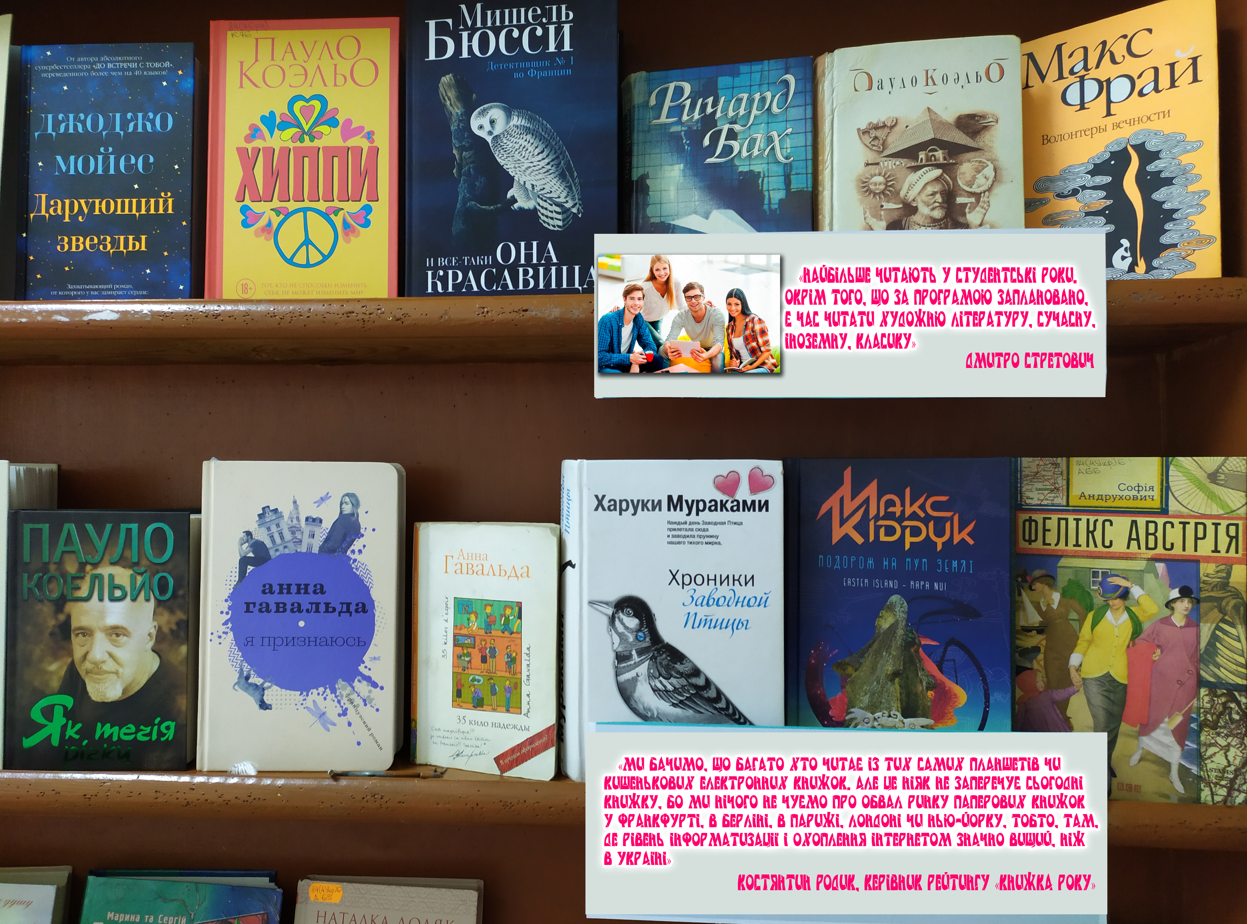 На виставці представлені як абсолютні бестселлери серед молоді (книги Пауло Коельо, Річарда Баха, Харукі Муракамі, Анни Гавальди), так і книги нових авторів, які стрімко набирають популярність: Айн Ренд із всесвітньо відомою книгою «Атлант розправив плечі», Мішель Бюссі із неперевершеними детективами, Габріель Зевін із своєю «Повсякденною логікою щастя», Енн Тайлер із зворушливим сімейним романом «Катушка синіх ниток».