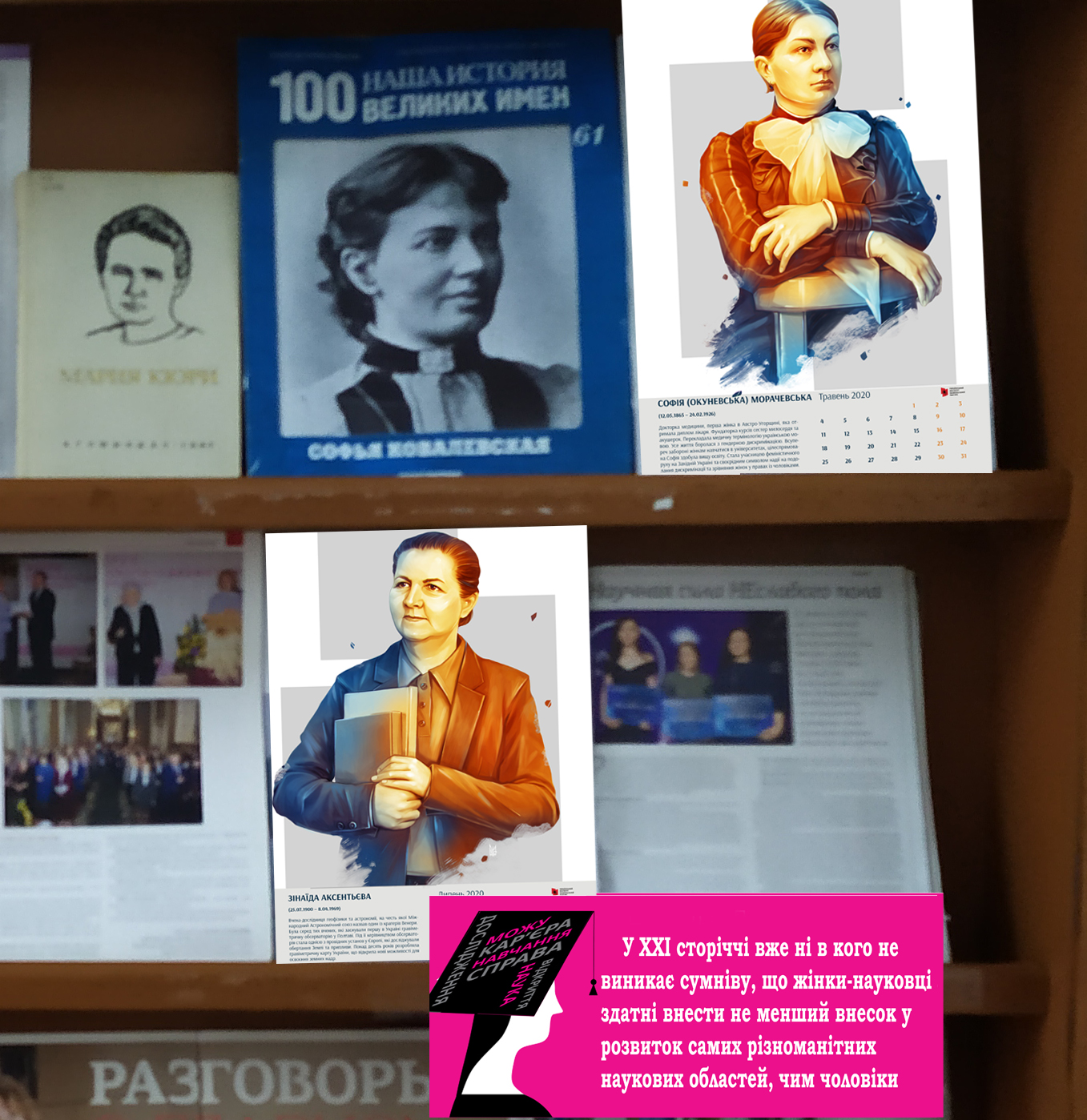Інформація про них представлена в книгах та на шпальтах часописів, які представлені на виставці. В журналі «Світогляд» тема славетних жінок в науці України присутня в багатьох рубриках протягом не одного року. Це жінки-фізики І. Б. Мізецька, Н. А. Власенко, Н. М. Литовченко, Н. Б. Лук̕ янчикова, І. Б. Єрмолович. А також три молоді переможниці програми «Для жінок у науці»: Наталя Щербань- винахідник в області фізичної хімії, Олена Ванєєва – старший науковий співробітник інститута математики НАН України, Марія Байляк -науковець в області біології Прикарпатського національного університету ім. В. Стефаника.