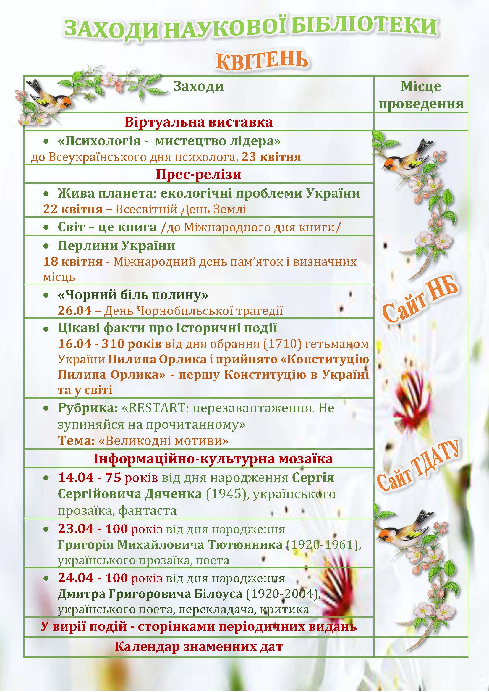 Заходи наукової бібліотеки на квітень