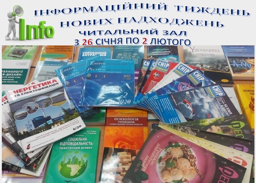Запрошуємо ознайомитись з новинками 26.01.2021 Перегляд нових надходжень у читальному залі з 26 січня по 2 лютого за спеціальностями університету.