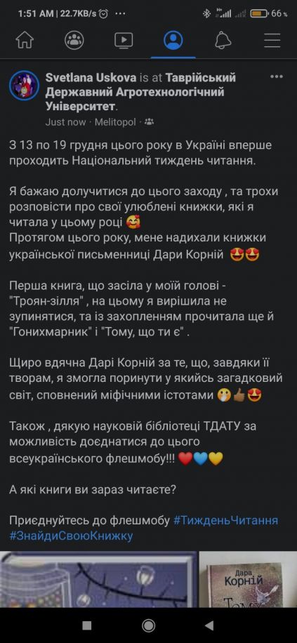 А для цього ми зробили цікаві пости на тематику читання у різних соціальних мережах: Facebook, Instagram, на сторінці веб-сайту наукової бібліотеки, на блозі БІБЛІО LIFE. Найцікавіші з них пропонуємо до вашої уваги та закликаємо приєднатися всіх бажаючих до акції. Для цього вам потрібно розмістити цікавий пост, світлину чи відео, які якимось чином пов’язані з читанням у вашому житті та показують, що читання не тільки пробуджує у вас різноманітні емоції, але і є вашою життєвою стратегією.