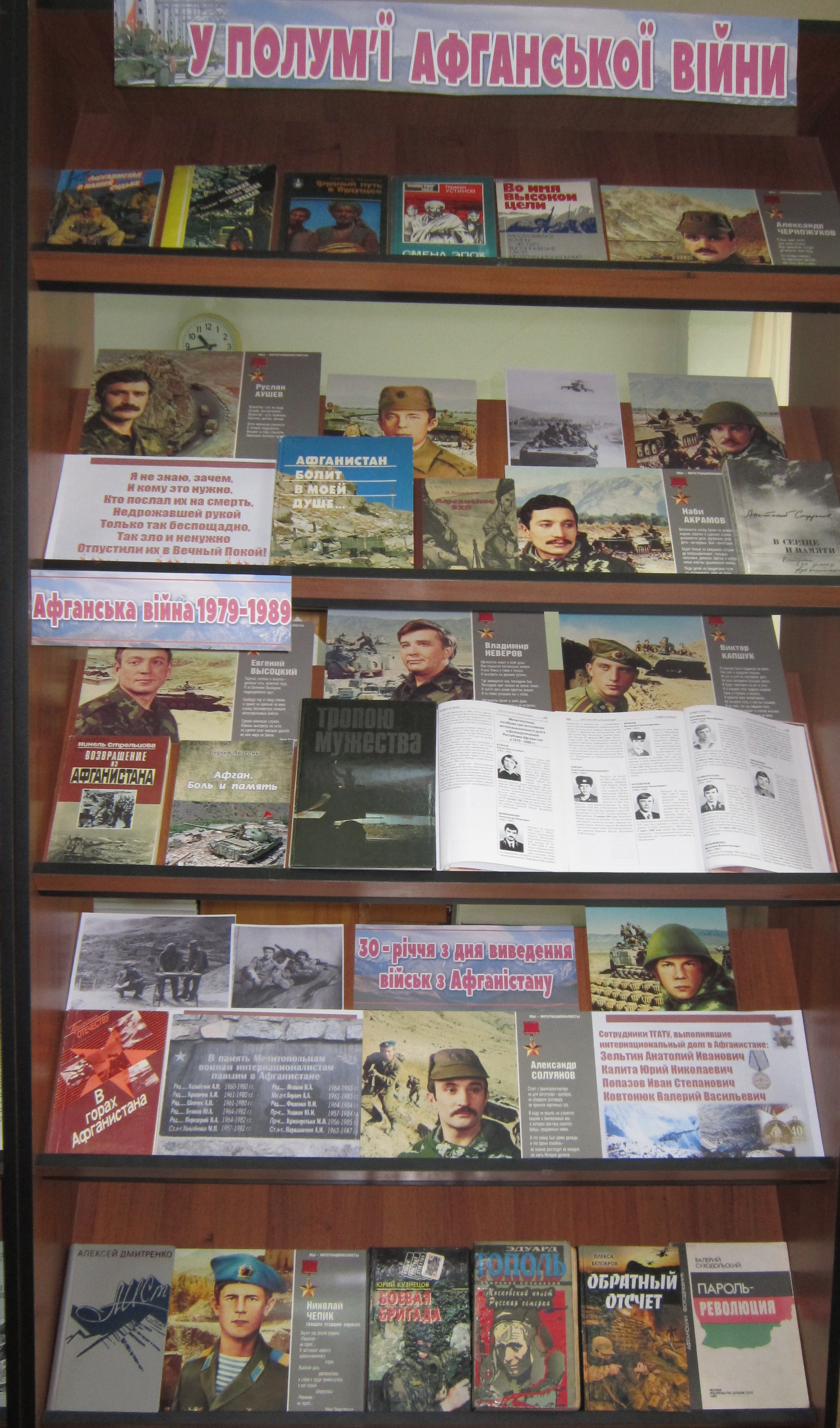 На виставці представлені видання, присвячені тим важким рокам: В. Кирьязов «Афганское эхо», С. Авдеенко «Афган. Боль и память», Н. Стрельцова «Возвращение из Афганистана», А. Сафронов «В сердце и памяти», Ю. Кузнецов «Боевая бригада» та ін.