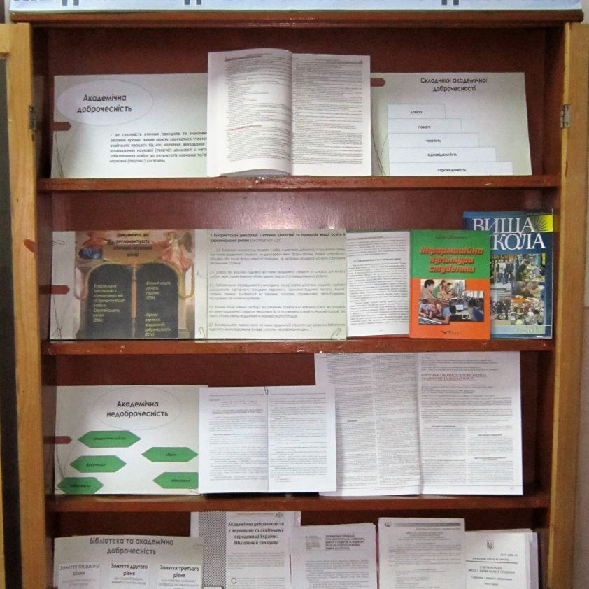 Наукова бібліотека підготувала тематичну виставку «Академічна доброчесність – кодекс честі», яка знайомить викладачів, науковців, студентів з сукупністю етичних принципів та визначених законом правил, якими мають керуватися учасники освітнього процесу під час навчання, викладання та впровадження наукової (творчої) діяльності з метою забезпечення довіри до результатів навчання та наукових досягнень. На виставці представлено нормативні документи, статті з періодичних та методичних видань.