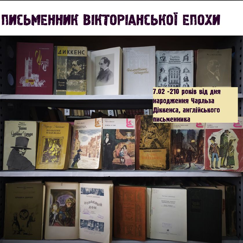 До 210-річчя від дня народження визначного англійського письменника Чарльза Діккенса, яке відзначається 7 лютого, наукова бібліотека підготувала тематичну виставку «Письменник вікторіанської епохи».На виставці представлені твори, які прославили Діккенса серед читацького світу: цикл «Різдвяні повісті», романи «Крамниця старожитностей», «Домбі і син», «Девід Копперфілд», «Маленька Дорріт», «Великі сподівання», «Холодний будинок», «Посмертні записки Піквікського клубу», «Таємниця Едвіна Друда» та інші.