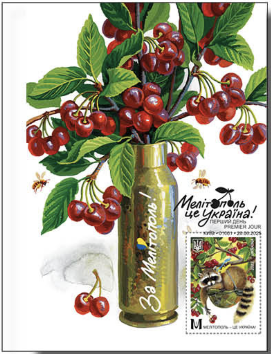 На поштовій марці зображено легендарну мелітопольську черешню та славнозвісного єнота з херсонського зоопарку — як символи того, що українці завжди повертають своє: і вкрадені території, і вкрадених тварин.