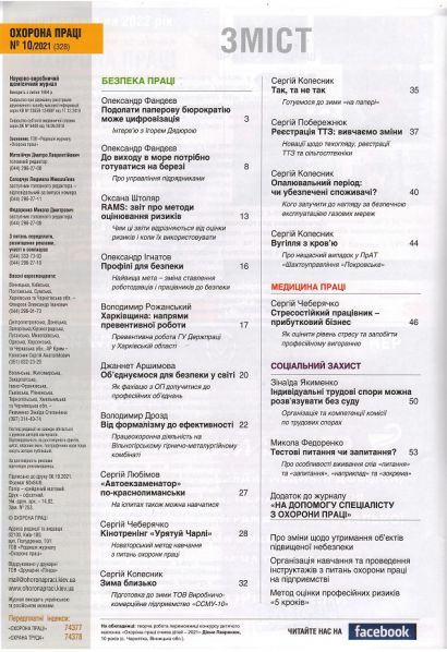 7. «Охорона праці»№10 – щомісячний науково-виробничий журнал. На сторінках видання, окрім фахової інформації, затребуваної спеціалістами з охорони праці, інженерами підприємств, публікуються статті про: захист трудових прав працівників, наглядову та сервісну діяльність Державної служби України з питань праці, проблеми соціального захисту осіб, потерпілих на виробництві, соціальне забезпечення/реабілітацію інвалідів праці, діяльність організацій інвалідів, діяльність Фонду соціального страхування України, профілактику виробничого травматизму та професійних захворювань, нормативне регулювання питань охорони та гігієни праці, питання реабілітації учасників АТО тощо.
