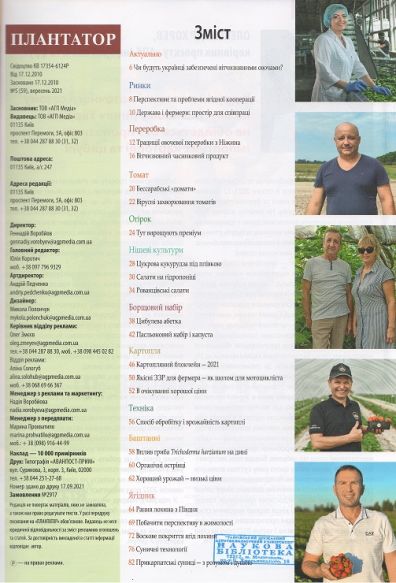 9. «Плантатор» №5 – аграрний журнал українських господарів та справжніх плантаторів. Актуальні сезонні поради щодо ефективного ведення господарства, вирощування різних сортів і гібридів овочів – картоплі, моркви, буряків, капусти, цибулі, огірків, томатів, баштанних; та ягід – суниці, смородини, малини. Висвітлює зберігання, доробку та продаж овочів і ягід.