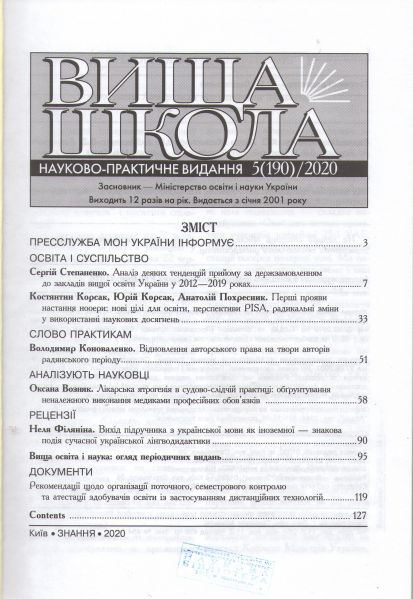 Науково-практичний журнал з питань діяльності закладів вищої освіти та підготовки кадрів вищої кваліфікації «Вища школа» №5