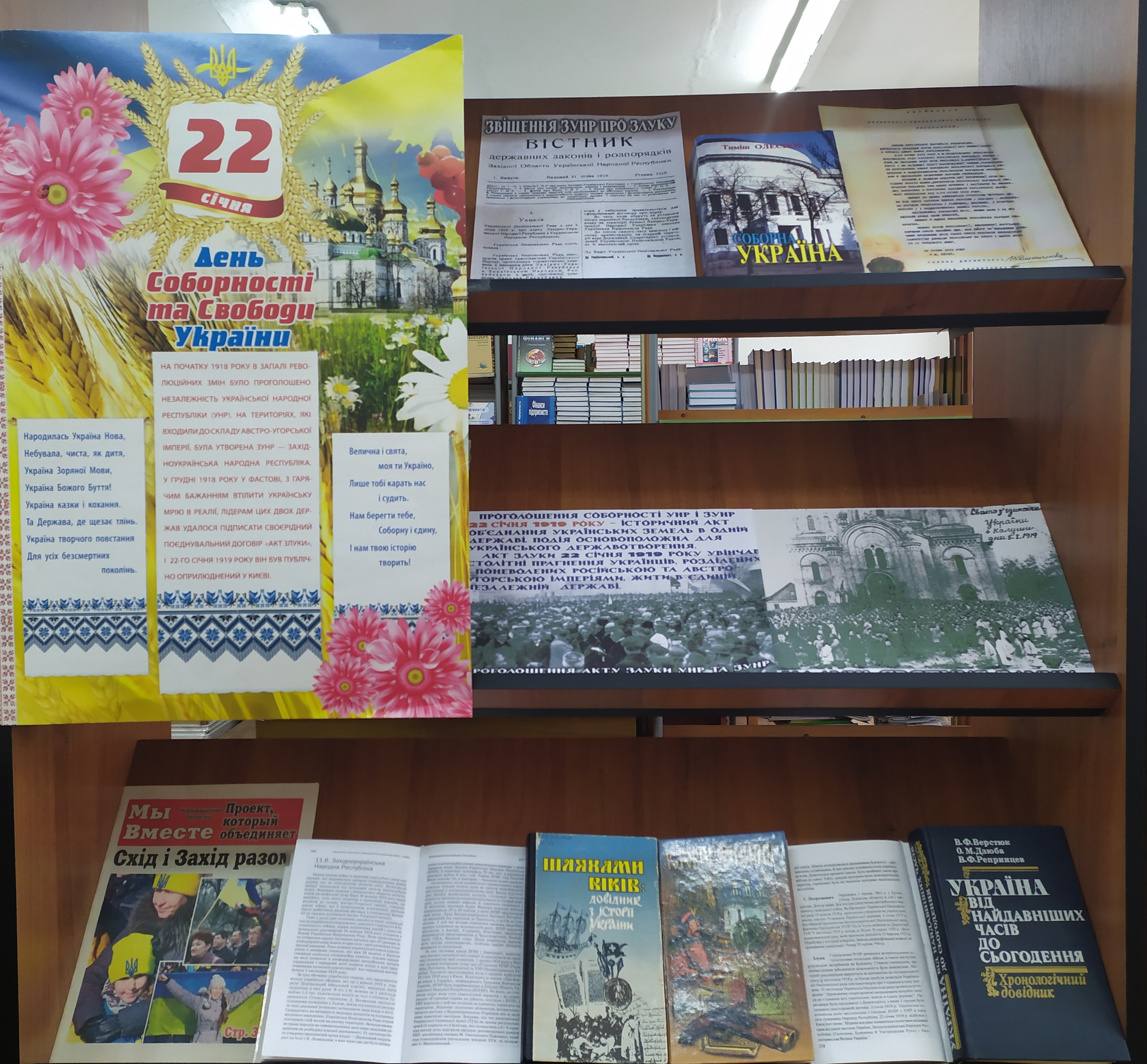 22 січня увійшло до національного календаря як велике державне свято – День Соборності України. Цього дня у 1919 року Директорія Української Народної Республіки проголосила Злуку всіх українських земель в єдину Українську державу. З нагоди важливої історичної дати наукова бібліотека ТДАТУ підготувала експрес-виставку «22 січня – ДЕНЬ СОБОРНОСТІ УКРАЇНИ». На виставці експонуються книги, які зможуть зацікавити читача до поглибленого вивчення історії та культурних вподобань українського народу: Т. Олексюк «Соборна Україна», О. Бойко «Історія України», М. Котляр «Шляхами України», В. Верстюк «Україна від найдавніших часів до сьогодення» та інші. Книги підібрані для студентської молоді з метою відродження паростків духовності, виховання поваги та любові до рідного краю, його історичного минулого і сучасності.