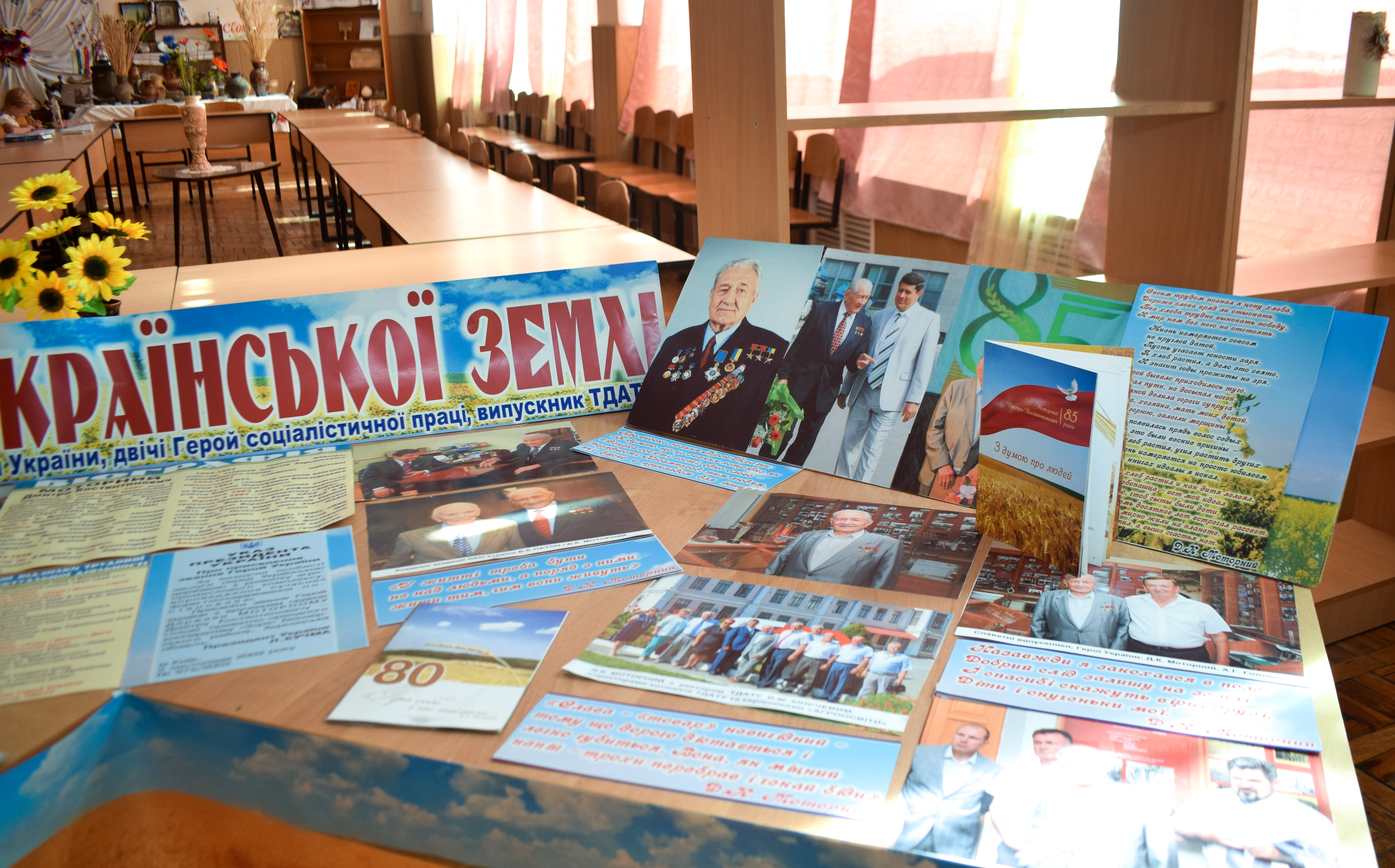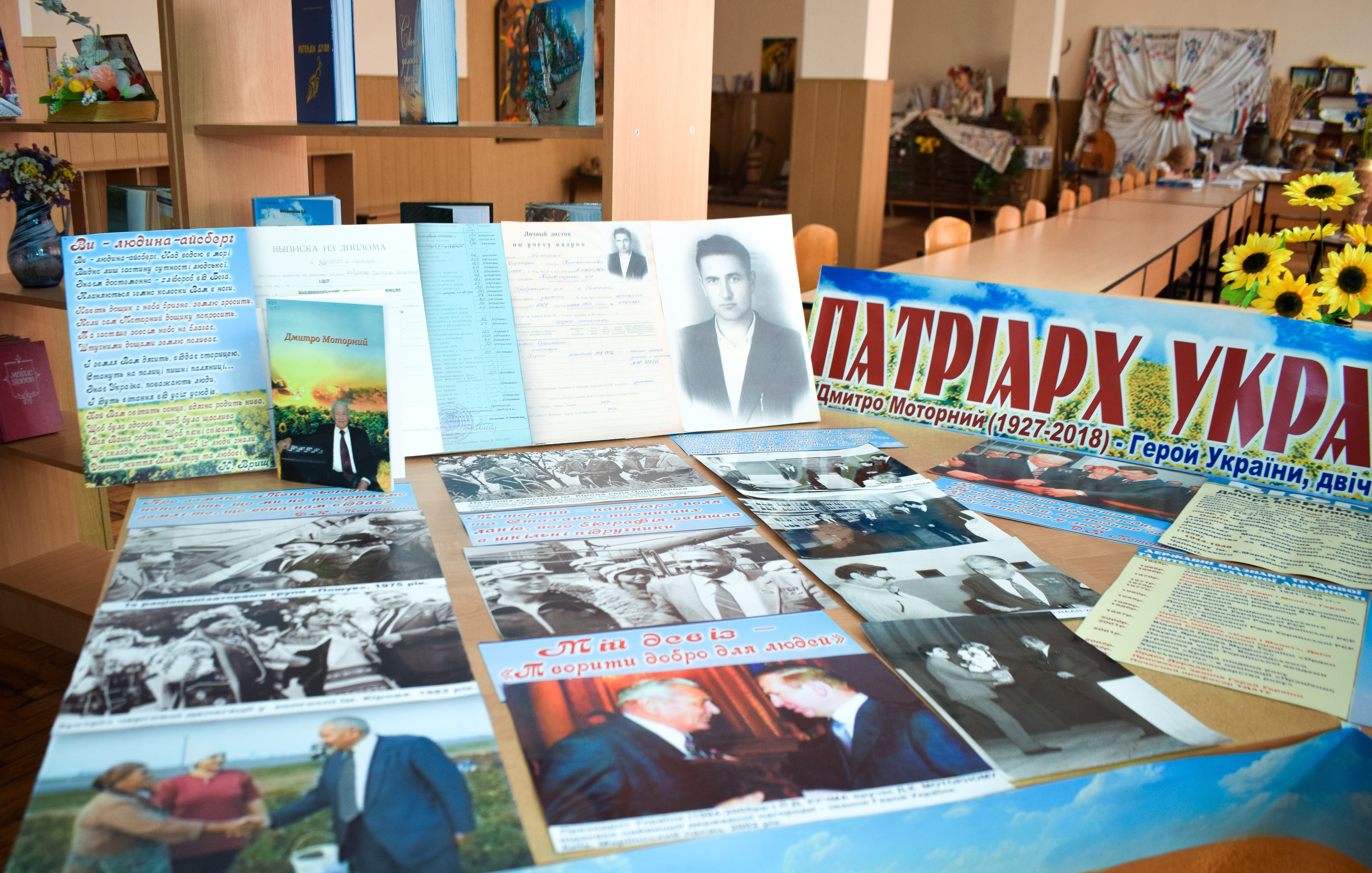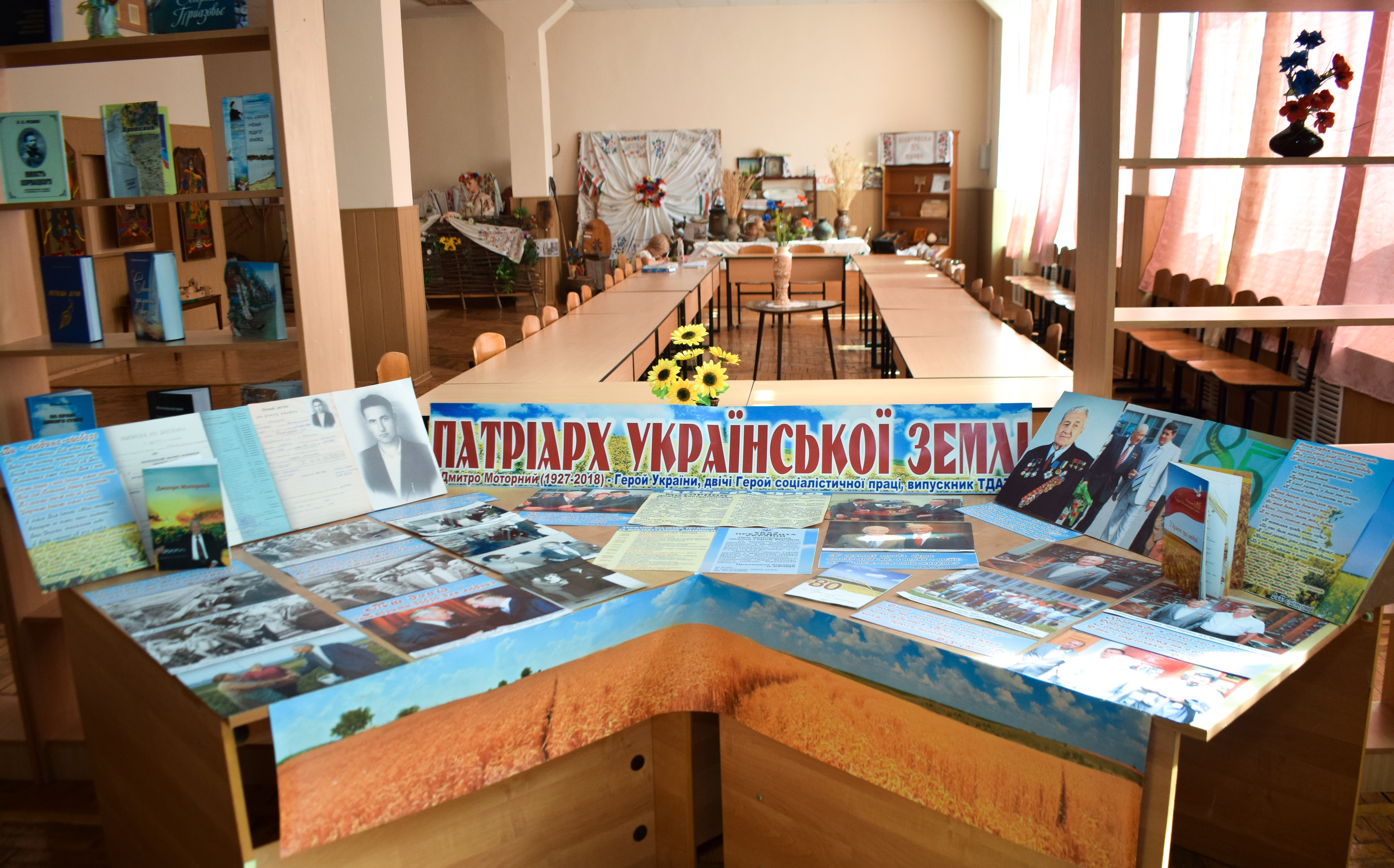 В рамках обговорення присвоєння ТДАТУ ім’я Дмитра Костянтиновича Моторного, в науковій бібліотеці представлена виставка-посвята «Патріарх української землі». Виставка – це зібрання унікальних фото-матеріалів, архівних документів та книг з життя Героя України, двічі Героя Соціалістичної Праці, почесного члена Національної академії аграрних наук України, керівника господарства із понад піввіковим досвідом, випускника нашого вузу, якому ще за життя поставили пам’ятник – Дмитра Костянтиновича Моторного.