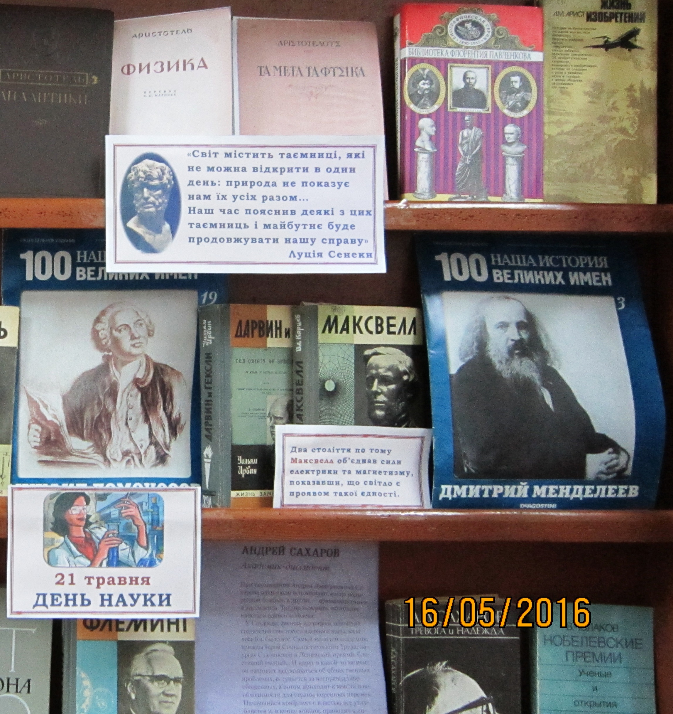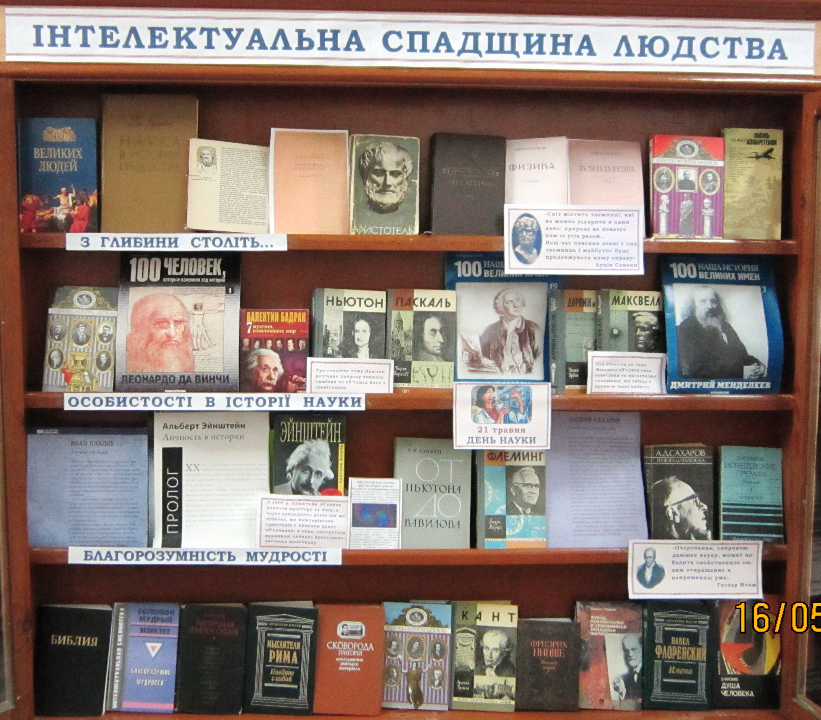 До дня науки в Україні наукова бібліотека підготувала тематичну виставку «Інтелектуальна спадщина людства». Це свято було засноване в 1997 році і відзначається в третю суботу травня.