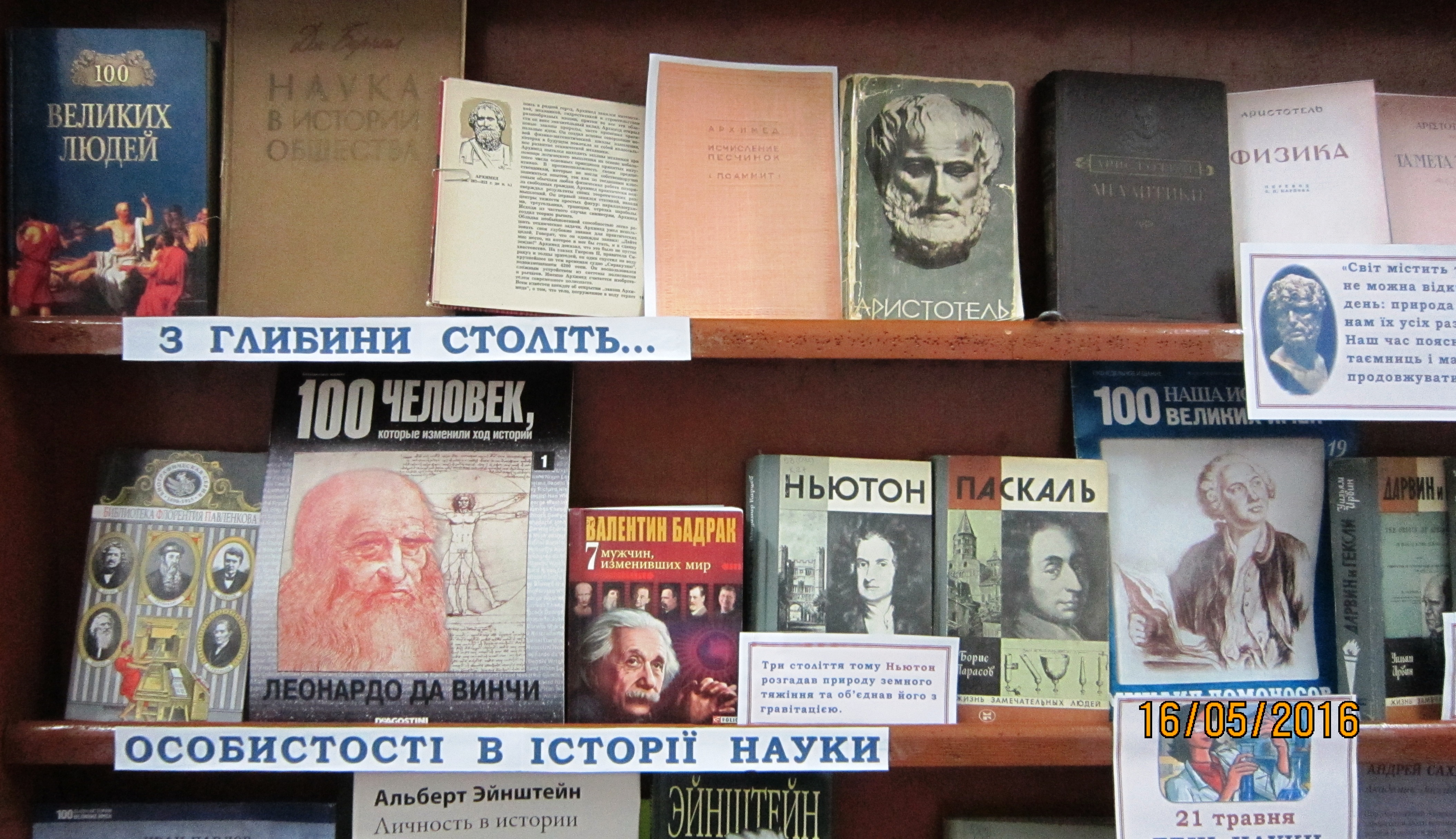 На виставці представлені науково-популярні та філософські праці, книги і журнали про відомих особистостей. Це насамперед корифеї науки Аристотель, Архімед, Дарвін, видатні особистості Ньютон, Ейнштейн, Ломоносов та ін. Окрема сторінка виставки присвячена фундаторам української науки В. Вернадському, Б. Патону, С. Корольову та Мелітопольським вченим-селекціонерам М. Сидоренку і М. Оратовському.