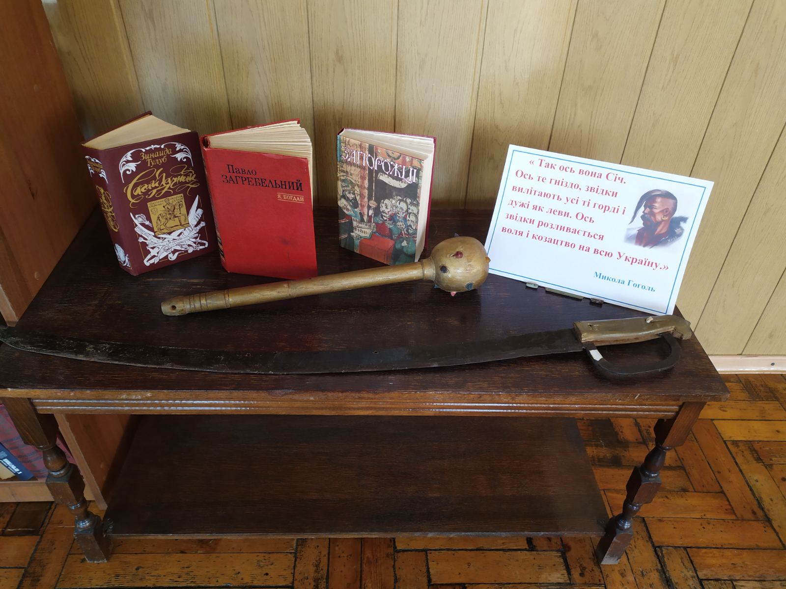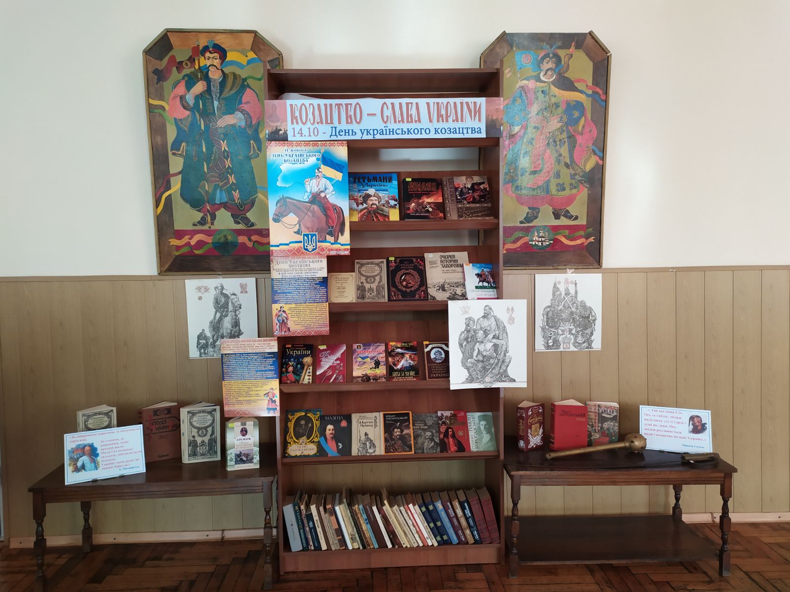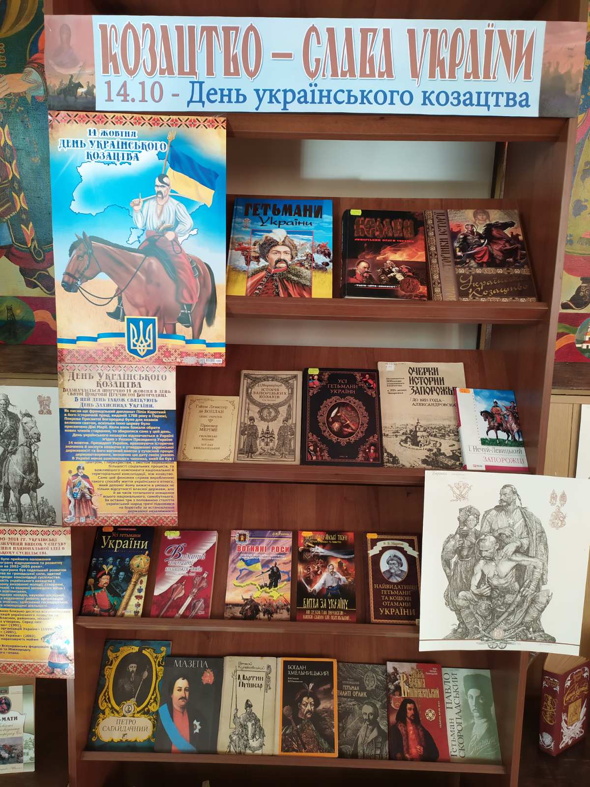 На тематичній виставці «Козацтво – слава України» представлені видання: О. П. Раєнт «Усі гетьмани України», Д.В. Сухінін «Вогняні роси», І. Нечуй-Левицький «Запорожці», Б. Лепкий «Битва за Україну», Л. Косенко «Козаки», Проспер Меріме «Українські козаки», Нартов В. В. «Найвидатніші гетьмани та кошові отамани України», Бачинська О. А. «Українське козацтво. Золоті сторінки історії» та інші.