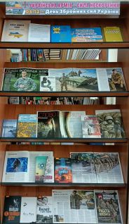 З цієї нагоди наукова бібліотека підготувала тематичну виставку «День збройних сил України», на якій представлені видання: В. Карецман «Правознавство», «Офіційний вісник України», Законодавство України про збройні сили, Указ Президента України про проходження громадянами України військової служби. У періодичних виданнях «Новое время», «Український тиждень» висвітлюються питання: «Новая военная элита», «Слово генерала», «Работа воевать», «Оголений тил».