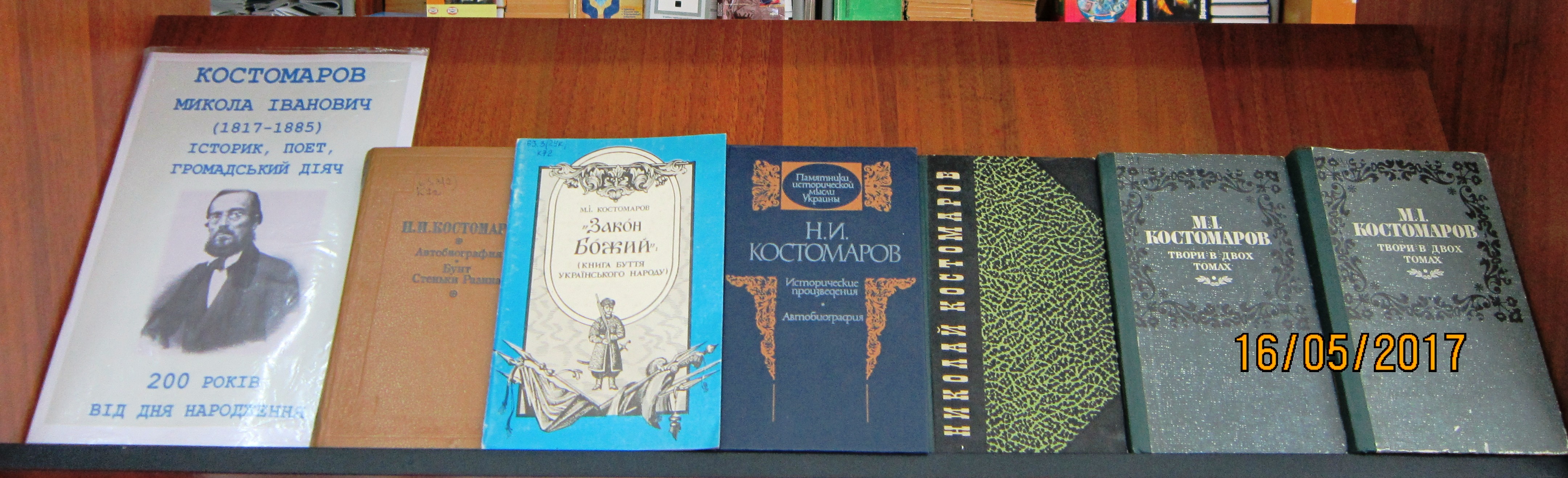 До 200-річчя М. І. Костомарова – видатного українського історика, етнографа, поета, прозаїка наукова бібліотека підготувала експрес-виставку. На виставці представлені автобіографія, документальні та художні твори Костомарова: «Закон Божий» (книга буття українського народу), «Исторические произведения» та ін..