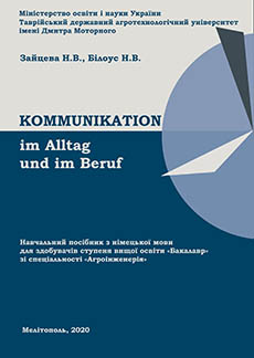 - Zaytseva, N. V. Kommunikation im Alltag und im Beruf = Спілкування в повсякденному житті та на роботі : навч. посібник / N. V. Zaytseva, N. V. Bylous ; ТДАТУ. – Мелітополь, 2020. – 273 с. : іл.