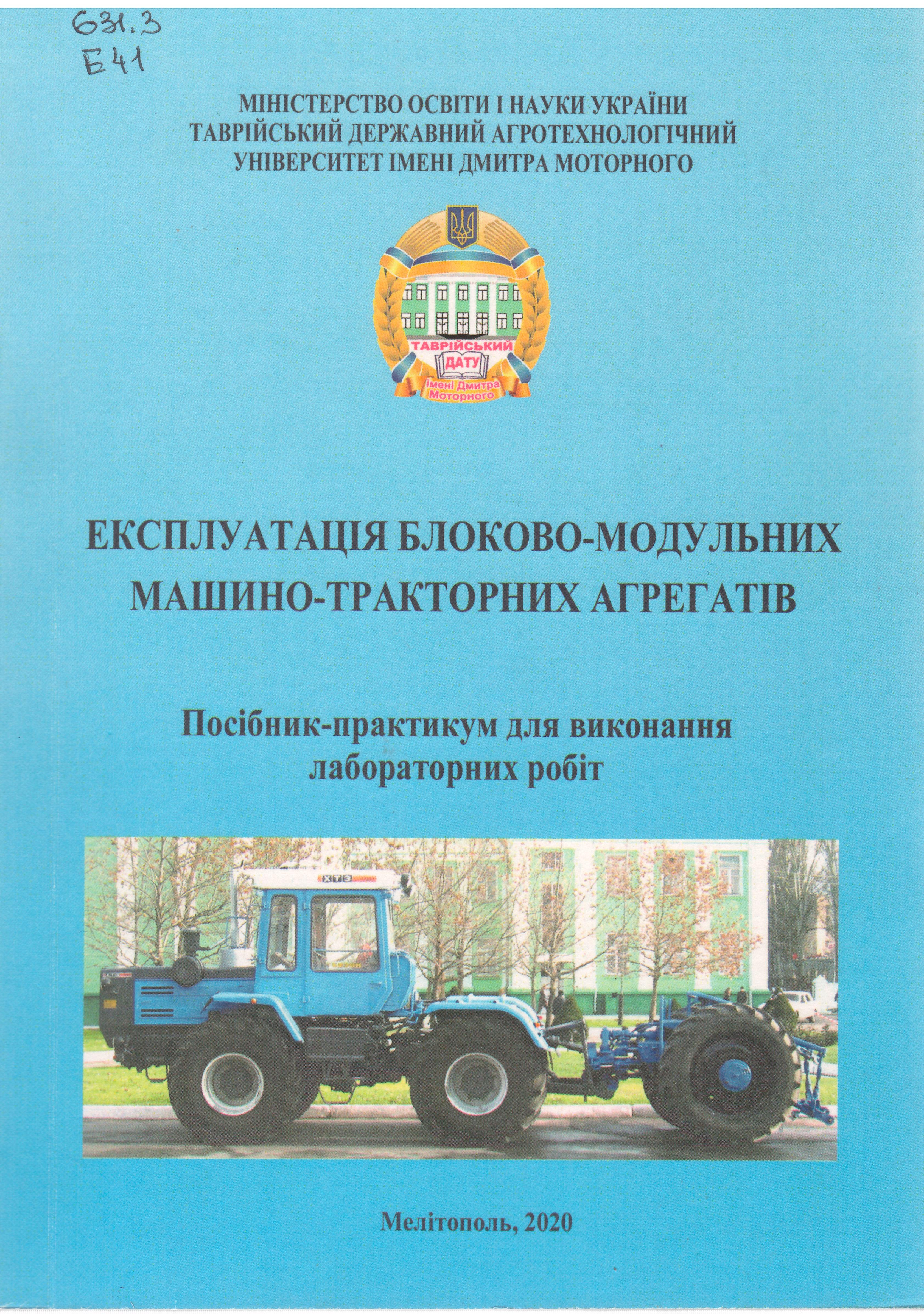 - Експлуатація блоково-модульних машино-тракторних агрегатів : посібник-практикум для виконання лаборат. робіт / В. Т. Надикто [та ін.] ; ТДАТУ. – Мелітополь, 2020. – 121 с.