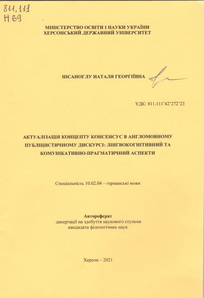 Нісаноглу, Н. Г. Актуалізація концепту КОНСЕНСУС в англомовному публіцистичному дискурсі: лінгвокогнітивний та комунікативно-прагматичний аспекти : автореферат дис. … канд. філол. наук : 10.02.04 / Н. Г. Нісаноглу ; Херсонський державний університет. – Херсон, 2021. – 17 с.