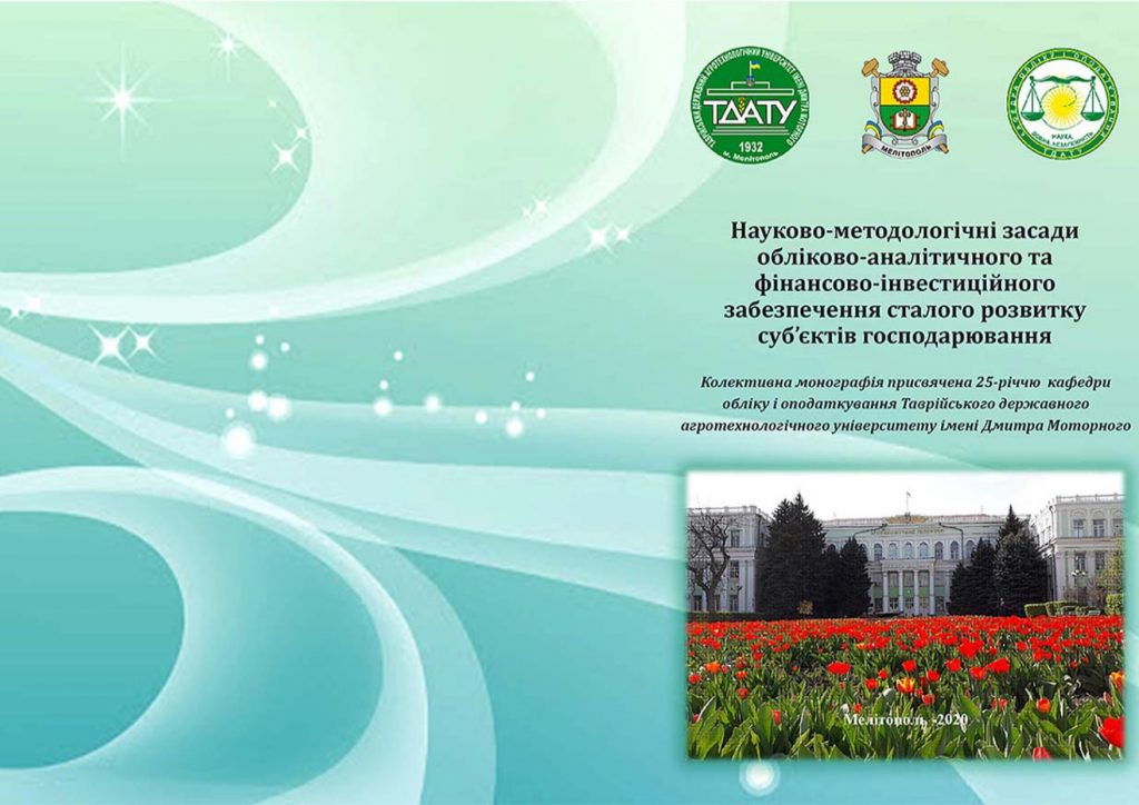 - Науково-методологічні засади обліково-аналітичного та фінансово-інвестиційного забезпечення сталого розвитку суб’єктів господарювання : колективна монографія : присвячена 25-річчю кафедри обліку і оподаткування Таврійського державного агротехнологічного університету імені Дмитра Моторного / ТДАТУ ; за заг. ред. О. Г. Сокола. – Мелітополь, 2020. – 268 с.