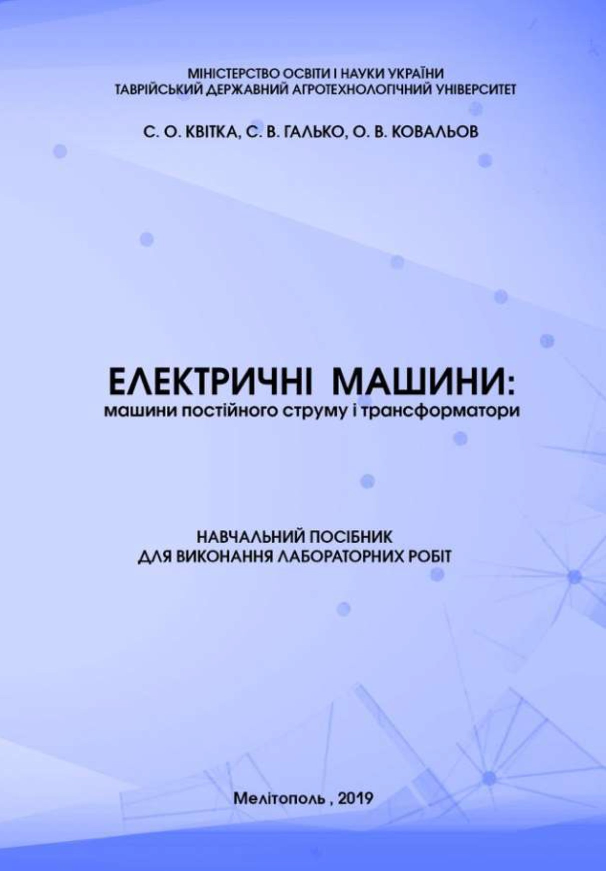 - Квітка, С. О. Електричні машини: машини постійного струму і трансформатори : навч. посібник для виконання лаборат. робіт / С. О. Квітка, С. В. Галько, О. В. Ковальов ; ТДАТУ. – Мелітополь, 2019. – 167 с.