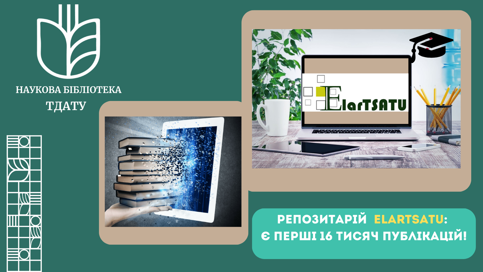 Днями ElarTSATU вийшов на новий рівень -16 тисяч публікацій у фондах репозитарію! Майже за рік фахівці наукової бібліотеки завантажили близько тисячі документів. На сьогодні у репозитарії накопичено 16015 документів, сформовано 22 колекції.