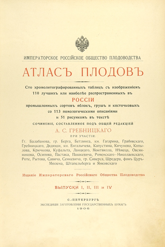 «АТЛАСЪ плодовъ», виданий у 1906 році у Санкт-Петербурзі. У книзі представлені зображення 110 найкращих та найбільш поширених в Росії промислових сортів яблук, груш та кісточкових з 113 помологічними описами та 51 малюнками. АТЛАСЪ плодовъ є антикварним виданням, тому підлягає більш детальній характеристиці. Його автор Адам Станіславович Гребницький (Докторович) – видатний російський селекціонер. Вихід у світ цього видання було значною подією в історії вітчизняного плодівництва. Гребницький не лише редагував «Атлас», йому належать описи більше третини поміщених у виданні сортів яблуні, груші, черешні, абрикоси і 33 кольорові малюнки.