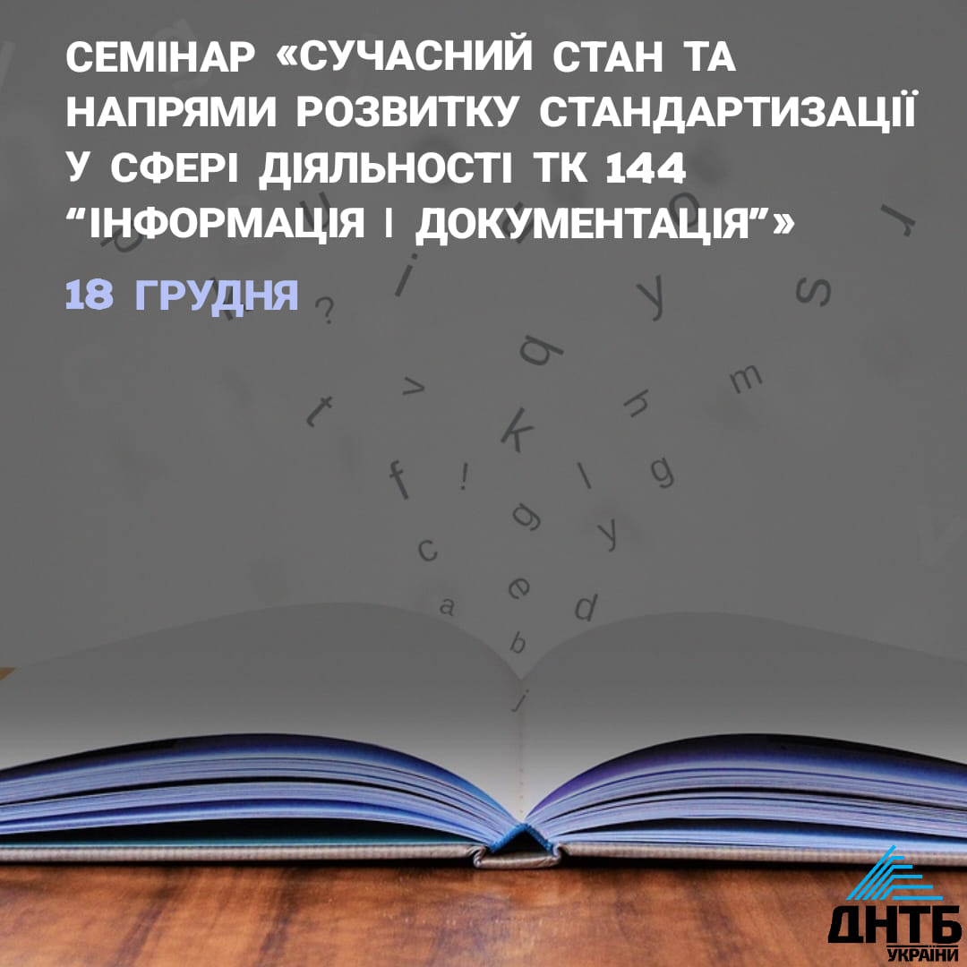 ДНТБ запрошує взяти участь у науково-практичному семінарі «Сучасний стан та напрями розвитку стандартизації у сфері діяльності ТК 144 “Інформація і документація”».