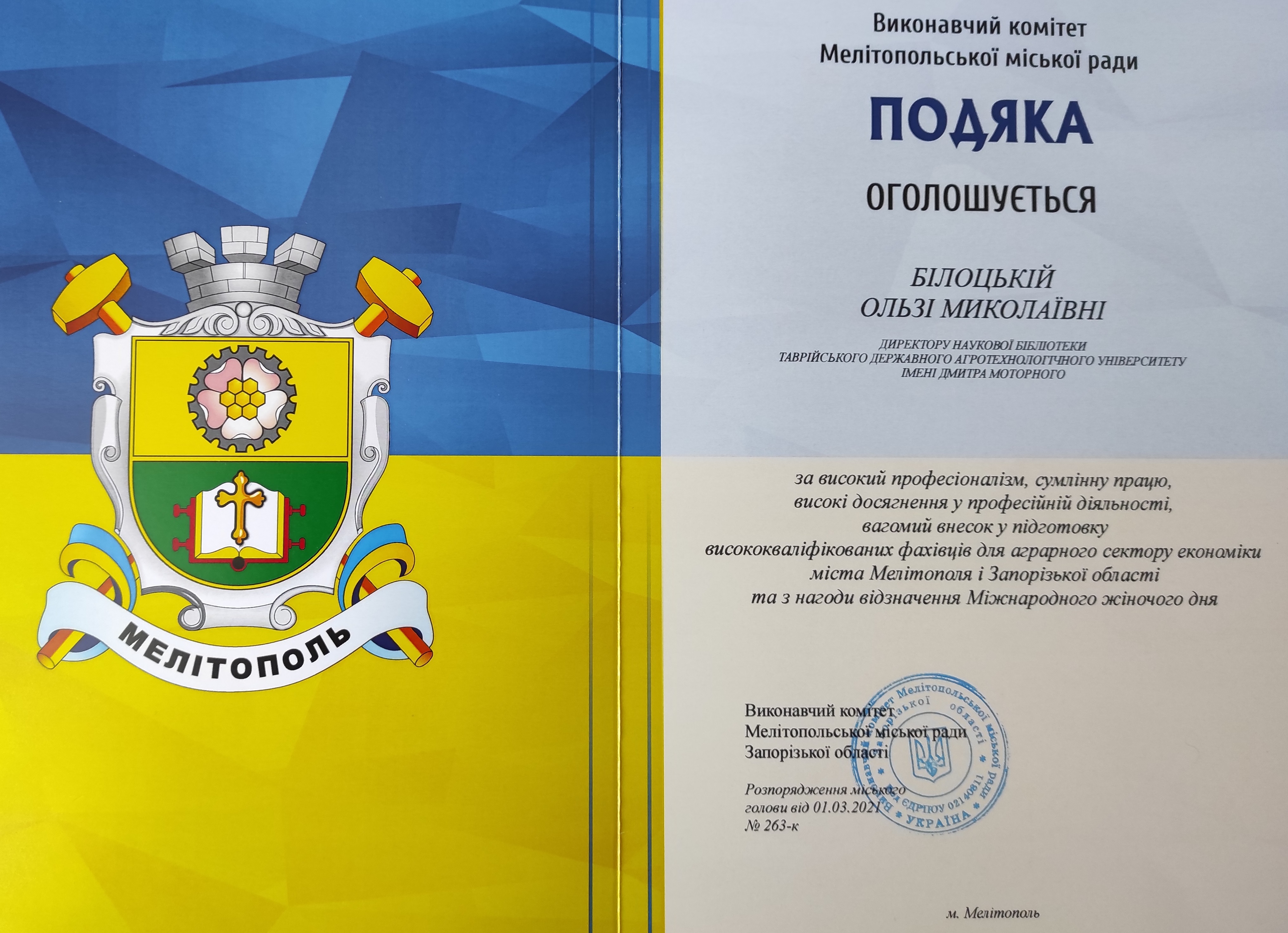 З нагоди відзначення Міжнародного жіночого дня, директор наукової бібліотеки ТДАТУ, Білоцька Ольга Миколаївна, отримала Подяку від виконавчого комітету Мелітопольської міської ради за високий професіоналізм, сумлінну працю, високі досягнення у професійній діяльності, вагомий внесок у підготовку висококваліфікованих фахівців для аграрного сектору економіки міста Мелітополя і Запорізької області.