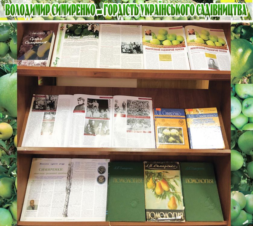 З цієї нагоди наукова бібліотека підготувала тематичну виставку «Володимир Симиренко – гордість українського садівництва», на якій представлено статті з часописів «Овощи и фрукты», «Огородник» та «Світогляд», де можна ознайомитися з науковими доробками та публікаціями про яскраву особистість в українській біологічній науці та в науковому садівництві, професора Володимира Симиренка. Науково-популярна книга Юрія Ковтуна «Сузір’я Симиренків» присвячена дослідженню виникнення і зростання родовідного древа славної династії Симиренків. У книзі автора Петра Вольвача «Л. П. Симиренко – фундатор українського промислового садівництва» розповідається про життя, самовіддану працю та величезний внесок у світову науку батька Володимира, Левка Платоновича Симиренка. У фондах наукової бібліотеки представлена фундаментальна тритомна праця Л. П. Симиренка «Помология», ілюстрована чудовими, майстерно виконаними акварельними малюнками плодів.