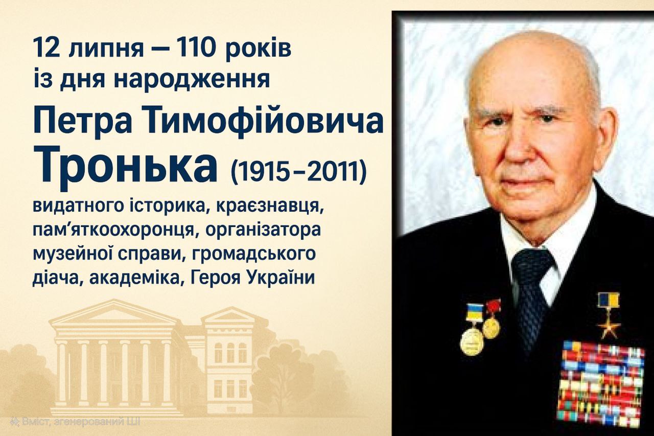 12 липня 2025 року Україна вшановує пам’ять видатного українця – 110 річницю з дня народження Петра Тимофійовича Тронька (1915-2011) – історика, краєзнавця, громадського діяча, доктора історичних наук, академіка, Героя України, Заслуженого діяча науки і техніки України.