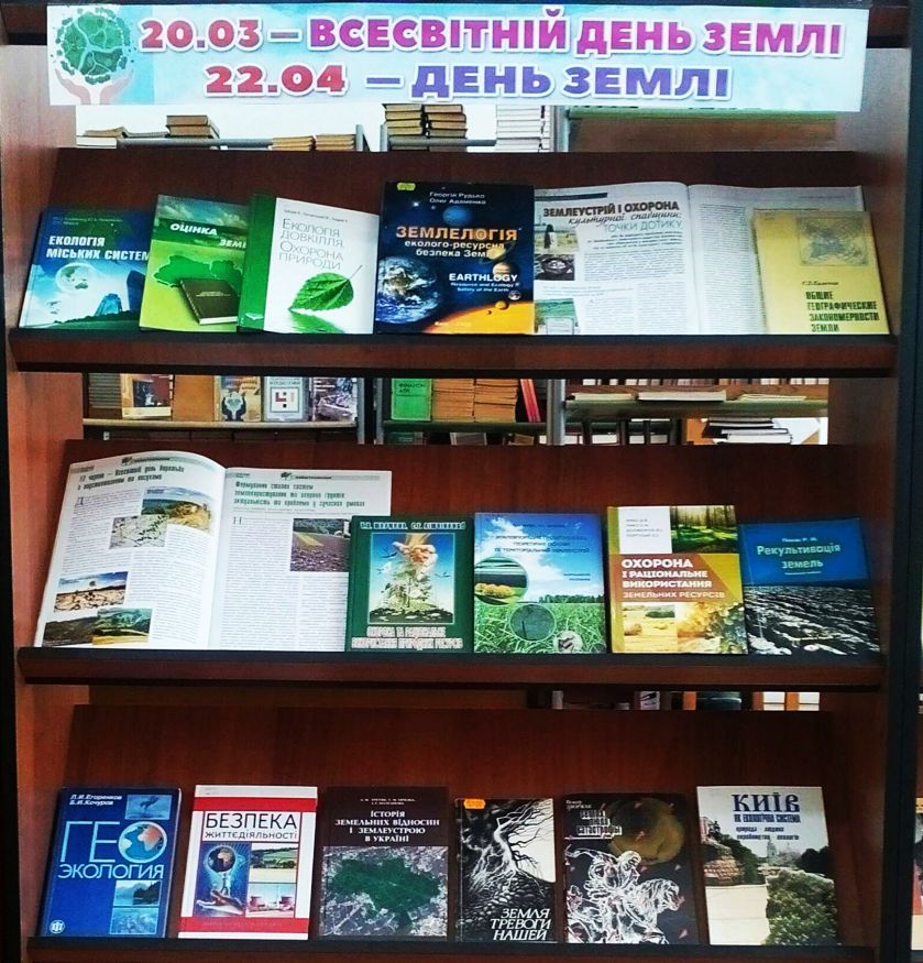 У фондах наукової бібліотеки тема екології, захисту природних ресурсів представлена досить широко. На експрес-виставці «Збережи землю для нащадків!», яка присвячена цим питанням представлені видання: Л.И. Егоренков «Геоэкология», Р.М. Панас «Рекультивація земель», В. Грицак «Екологія довкілля. Охорона природи», Г.І. Рудько «Землелогія. Еколого ресурсна безпека», тощо.