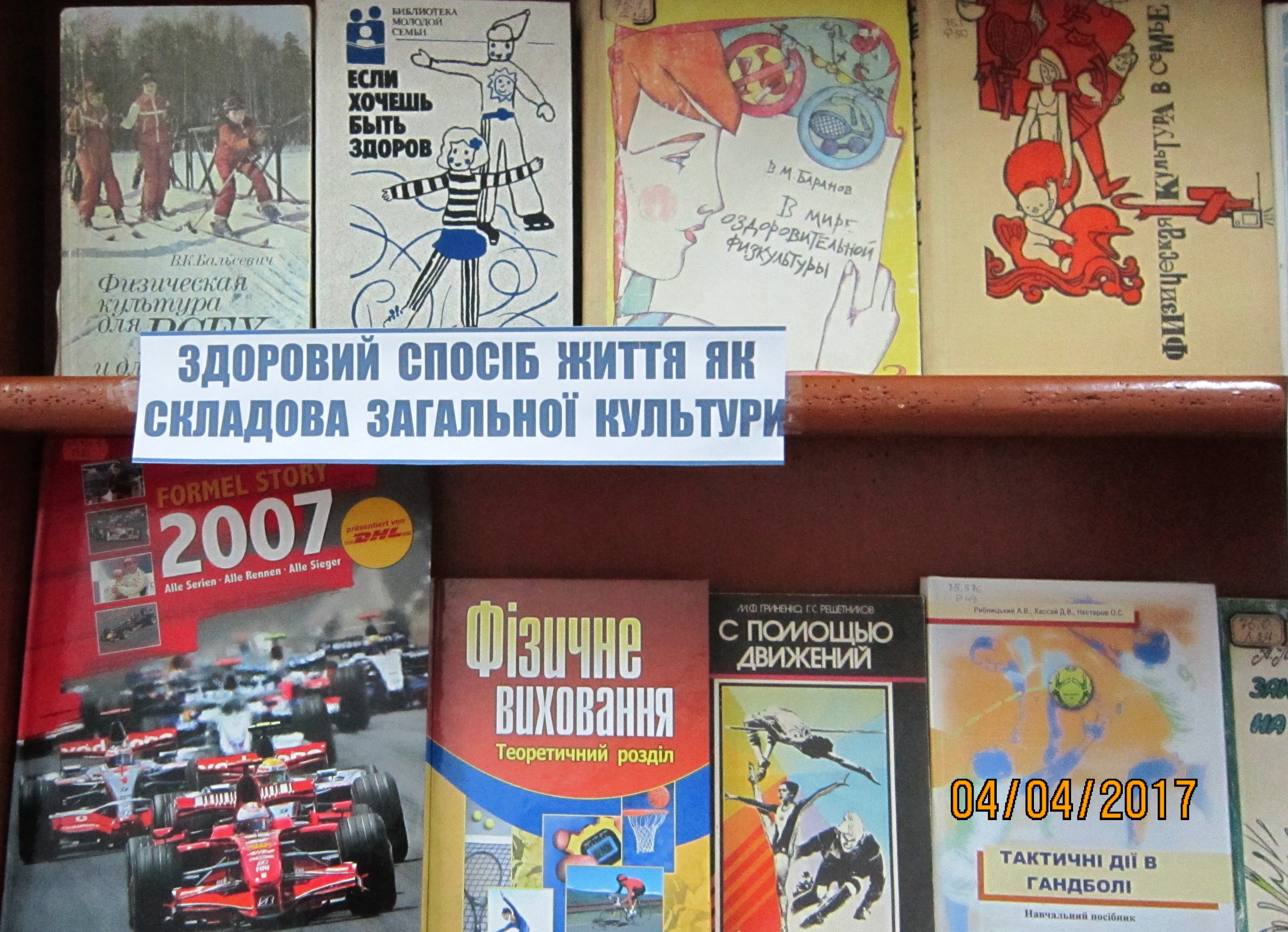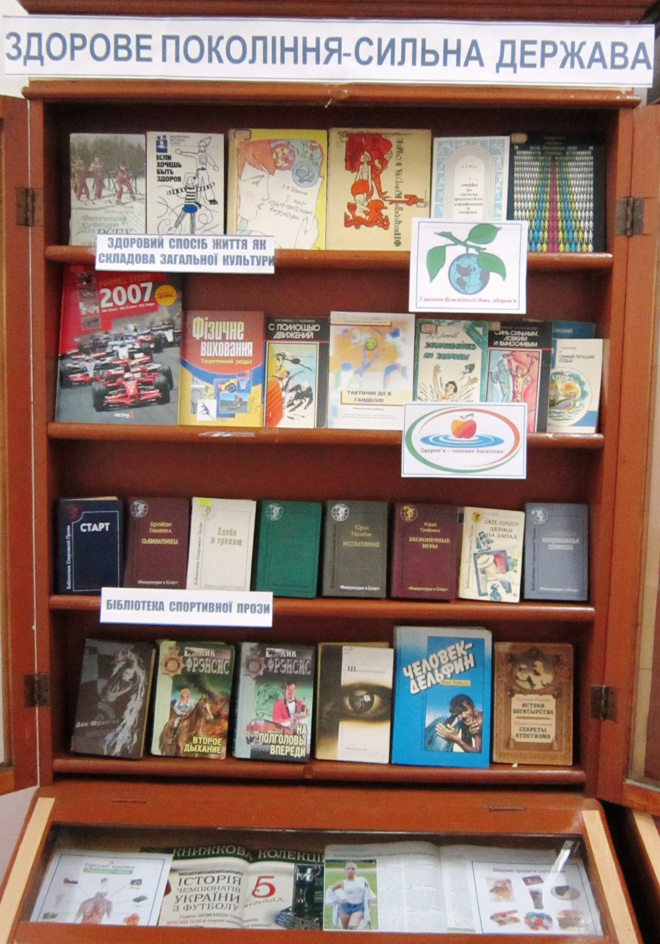 На виставці представлені книги, які пропагують здоровий та активний спосіб життя, зайняття фізичною культурою та спортом. Дуже цікава та актуальна для молоді серія «Бібліотека спортивної прози», до якої увійшли художні книги про спорт Глєнвилла Брайана «Олімпієць», Діка Френсіса «Фаворит», Джека Лондона «Прямуй на захід» та інші.