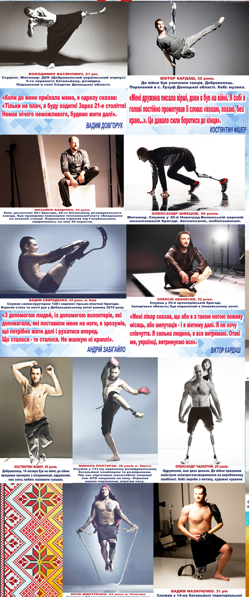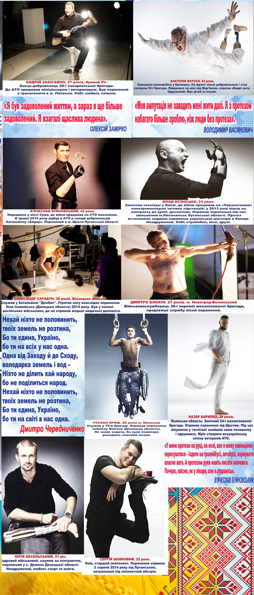 Це світлини та історії українських захисників – бійців та волонтерів, поранених на сході України. Колишні студенти, службовці, професійні військові, вчителі, винороби, були поранені на війні і тепер починають нове життя.