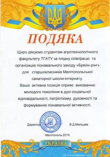 14 травня 2015 р. студентською радою факультету агротехнологій та екології ТДАТУ та заст. декана з ОВР Фазиловою Е.С. була проведена інтелектуальна гра «Брейн-ринг» в Мелітопольському школі-інтернаті №1.