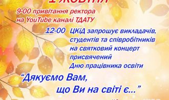 Центр культури та дозвілля Таврійського державного агротехнологічного університету імені Дмитра Моторного запрошує на святковий концерт до Дня працівника освіти В програмі: – Привітання та нагородження кращих викладачів та співробітників університету Почесними грамотами та Подяками. – Зачитання урочистого наказу по університету з нагоди свята. – Святковий концерт.