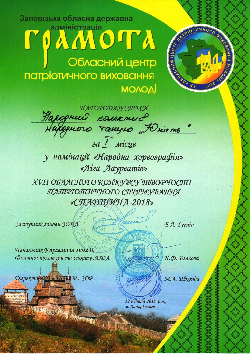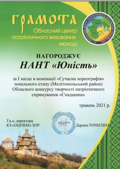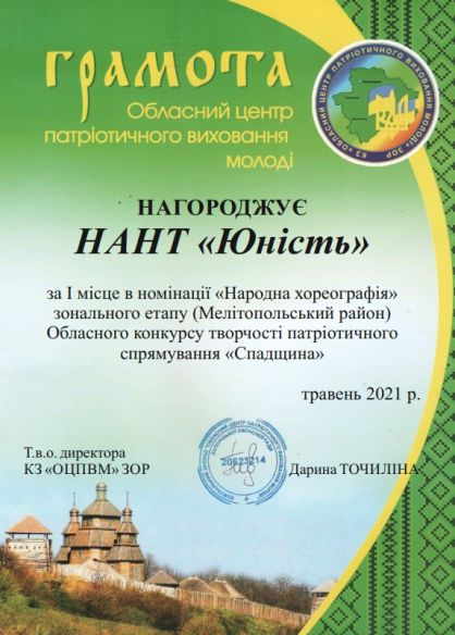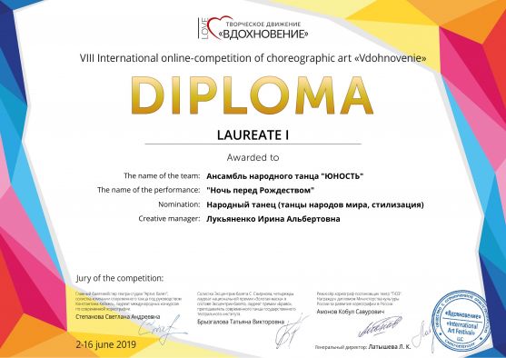 - ансамбль народного та сучасного танцю “Юність” лауреат I ступеню