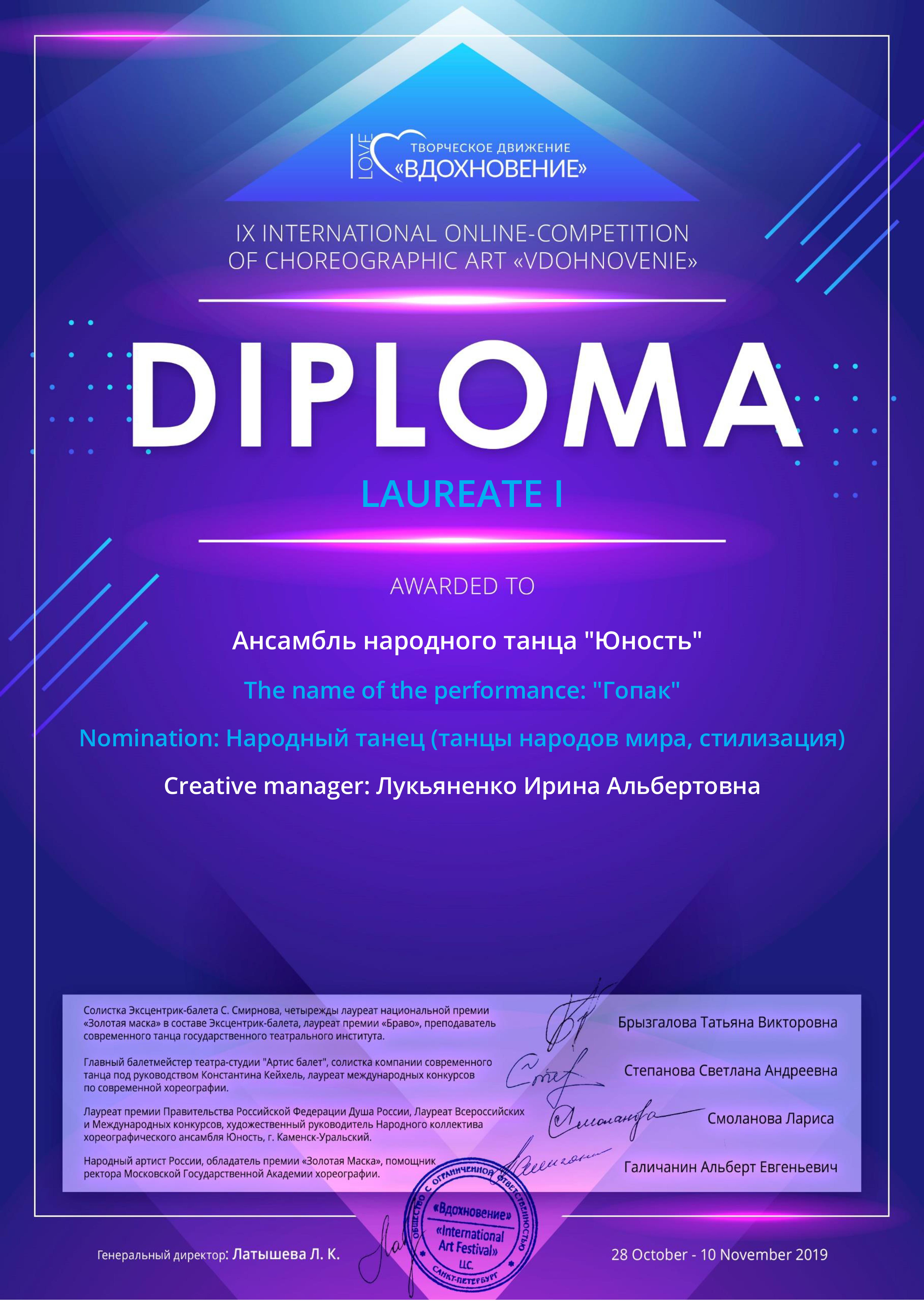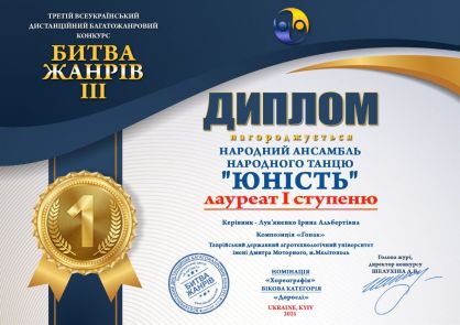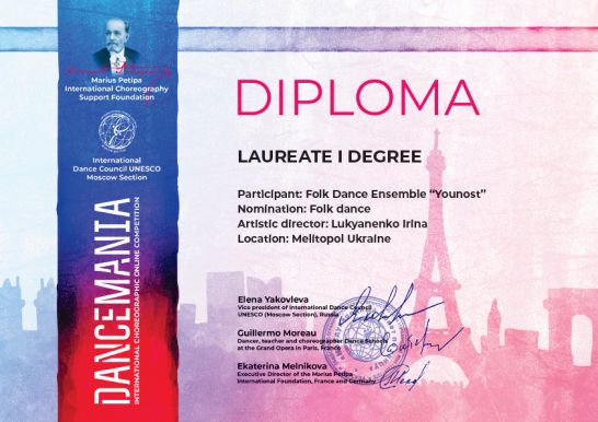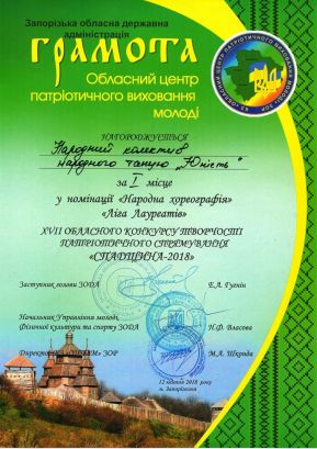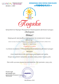 - Ансамбль народного та сучасного танцю “Юність” – лауреат I ступеня