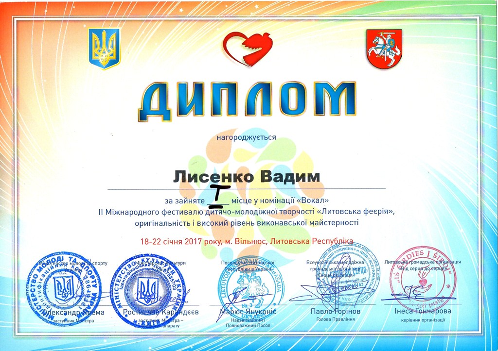 - Лисенко Вадим – I місце у номінації “Вокал”