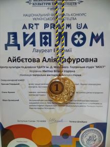 - Айбетова Алія- лауреат I премії у номінації “Театральне мистецтво”
