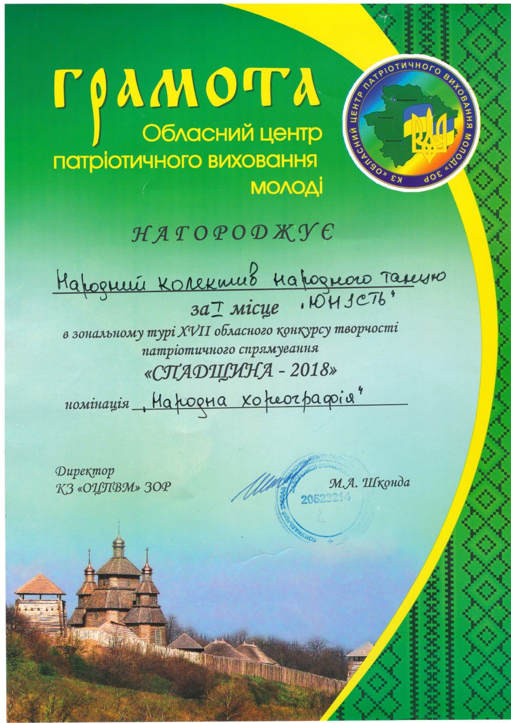 - Народний колектив народного танцю “Юність” – I місце у номінації “Народна хореографія”