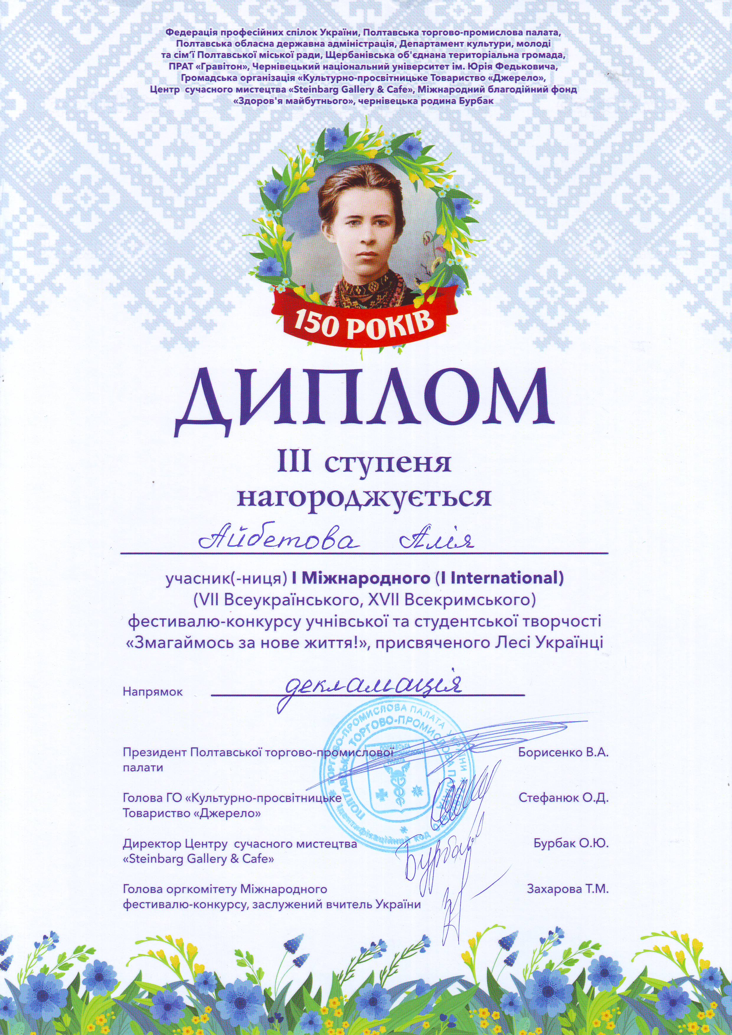 - Айбетова Алія – диплом III ступеня у напрямку “Декламація”