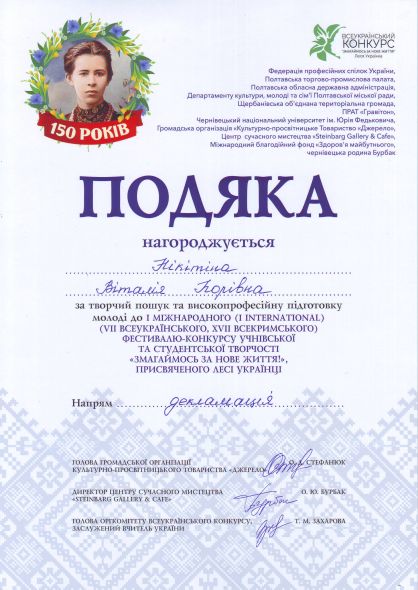 - Слободнюк Ірина – лауреат I ступеня у номінації “Розмовний жанр”