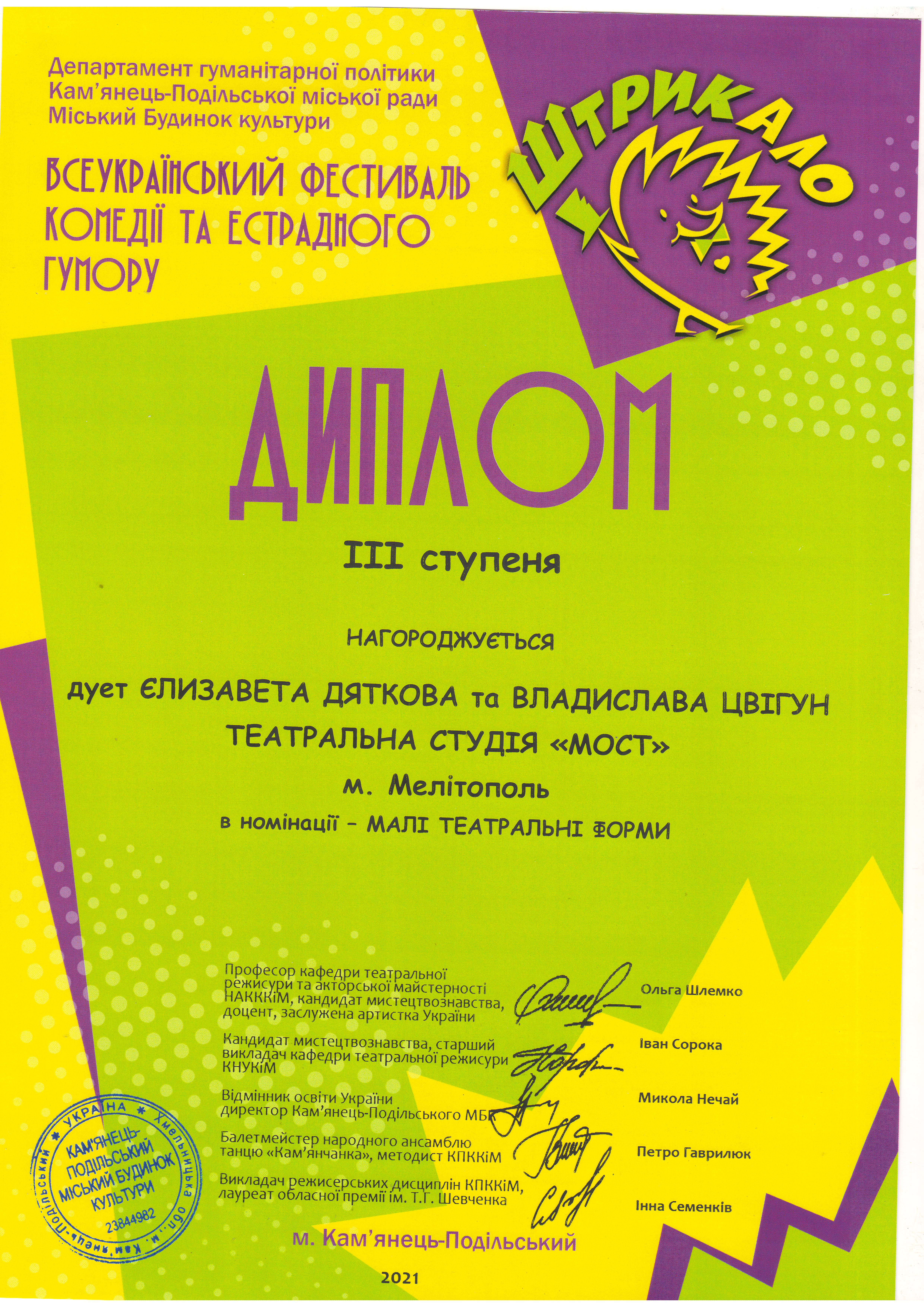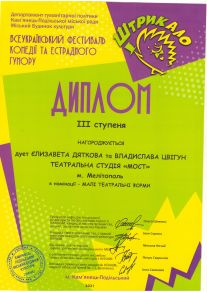 - Дует Єлизавета Дяткова та Владислава Цвігун – диплом ІІІ ступеня у номінації “Малі театральні форми”