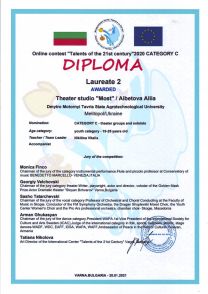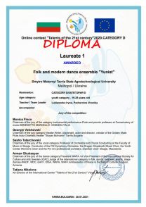 Другий місяць весни приніс у скарбницю перемог Центру культури та дозвілля Таврійського державного агротехнологічного університету імені Дмитра Моторного чергову нагороду. Відразу 3 колективи художньої самодіяльності прийняли участь у Міжнародному фестивалі-конкурсі “Таланти 21 сторіччя”, який дистанційно проходив у місті Варна у Болгарії. В перші ж дні після оглошення організаторами умов конкурсу надійшла фантастична кількість заяв на участь в ньому, понад 7500 учасників, тому деякі колективи зійшли з дистанції, не потрапивши навіть до першого туру. Такий ажіотаж можна виправдати тим, що до складу жюрі були залучені кращі міжнародні експерти в сфері музики, культури та мистецтва. Загалом майстерність наших вокалістів, театралів та хореографів була оцінена досить високо, всі вони ввійшли до фіналу і отримали дипломи різних ступенів. Ансамбль народного та сучасного танцю “Юність” отримав диплом Лауреата I ступеня, керівники Ірина Лук’яненко, Вероніка Почерніна. Вокальний колектив “Golden Voice” Лауреат II ступеня, керівник Олена Дорошенко, театральна студія “МОСТ” – Алія Айбетова – Лауреат II ступеня та Ірина Слободнюк – Лауреат III ступеня, керівник Віталія Нікітіна. Два колективи, ансамбль “Юність” та театральну студію “Мост” запрошено до Болгарії в червні цього року для участь в гала-концерті. Вітаємо переможців, так тримати!
