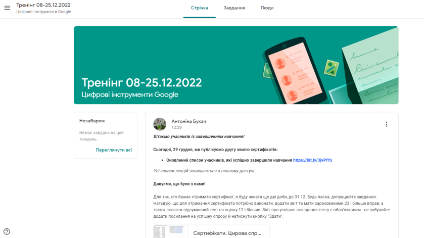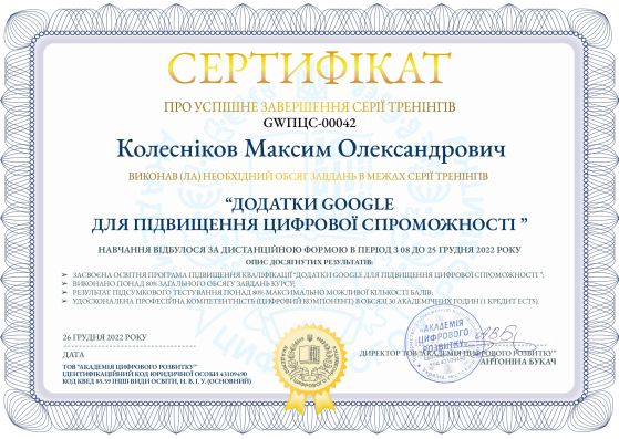 Унікальний формат курсу побудований на живому спілкуванні з тренерами Академії цифрового розвитку, ефективно підвищив професійні компетенції наших викладачів, які підтверджені сертифікацією Google for Education.